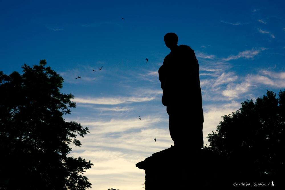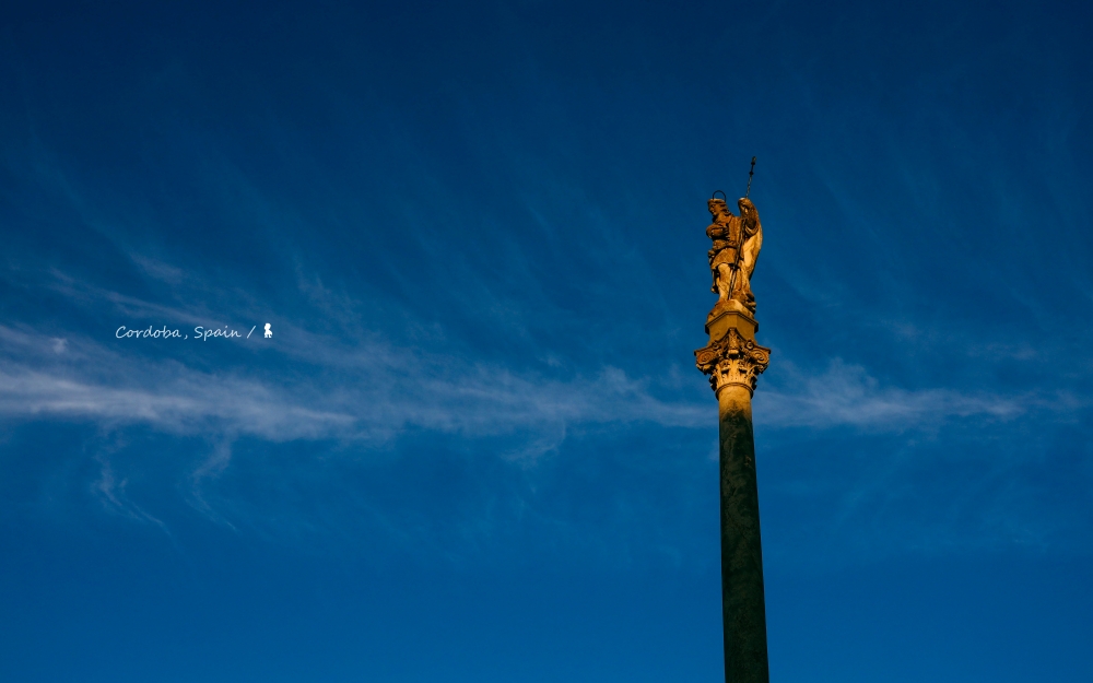 五月的科爾多瓦日落的晚,用完餐後就近散步已橫跨瓜達基維河長達兩千年的羅馬橋,瑰麗的晚霞,美了橋上雕像的剪影,另外天空還飄著如一根白羽的雲,襯著科爾多瓦守護天使聖拉斐爾的雕塑,薄暮中增添神聖祥和,彷彿傳遞蒙受祝福的喜悅,在這座充滿戲劇性的歷史古城。