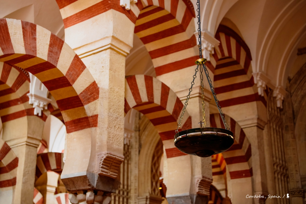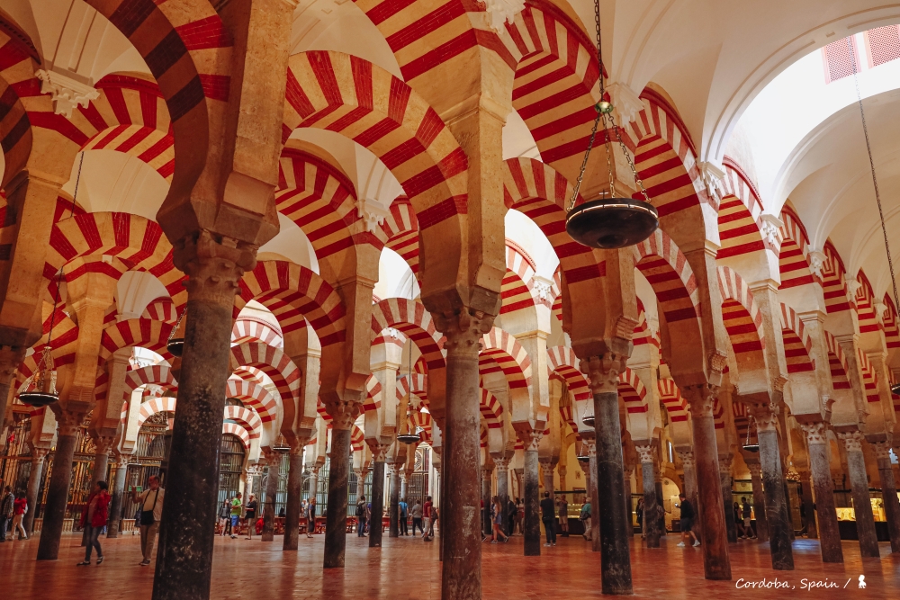 走進其中,東西方的混搭風格確實讓人有些難歸類,這也正是其魅力所在,最讓人印象深刻的是裡頭有多達17排共850根各種顏色的大理石柱,上頭承兩層重疊的紅白相間的馬蹄形卷,由紅磚和白雲石交替砌成,成為最具代表性的元素之一。除了白天參觀,我很推薦參加「The Soul of Cordoba」的夜間參訪行程,氣氛又是不同。