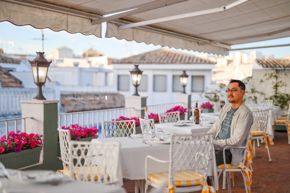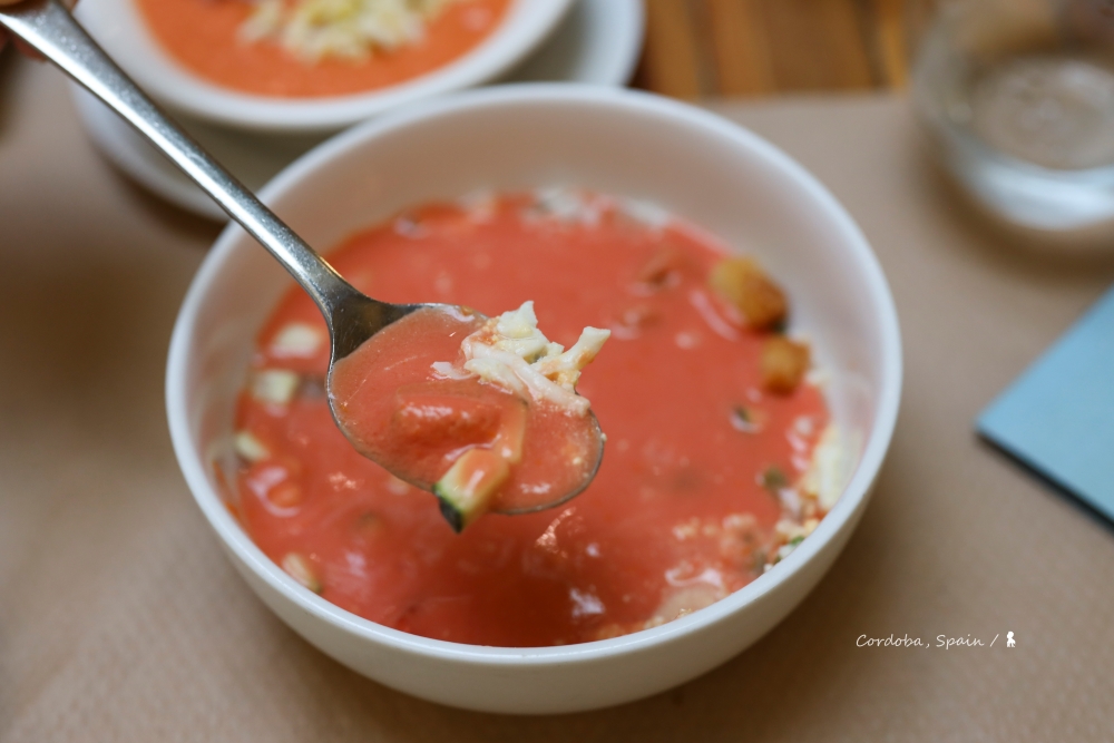 晚餐,我來到距離羅馬橋不遠、一間專賣科爾多瓦傳統料理的餐廳 Rabo de Toro,沒意外的外牆掛了鮮花裝飾,裡頭別有洞天頗具風味,我趁著候餐爬上屋頂用餐區參觀,悠閒的讓人喜歡。餐點除了招牌的燉牛尾,也很推薦清爽的番茄冷湯。
