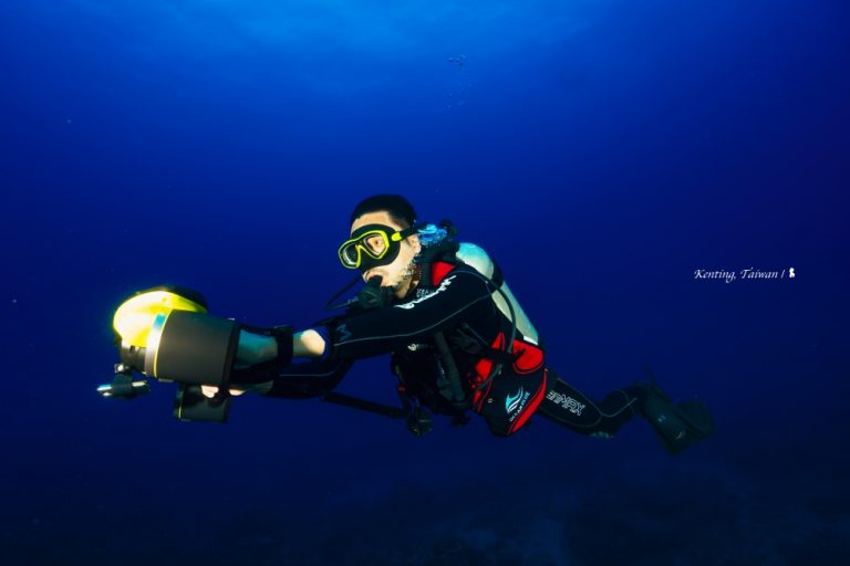 水中推進器(Diver Propulsion Vehicle, DPV)能讓潛水員大幅降低氣瓶消耗,能潛得更遠,特別是若遇上頂流能保留更多體力,這項專長也是目前潛水員的熱門證照之一。實際接觸後發現,其實要學會操作水中推進器不難,雙把手按下即可前進,有三種速度模式可選(Free-Sport-Turbo),立即可帶來前所未有的水下行動體驗!但需要留意的就是那份新鮮感所可能帶來的冒進,所以需要室內課以及教練隨時的叮嚀與提點,例如上升水面的速度一樣不能太快,千萬不可從水下垂直向上衝。