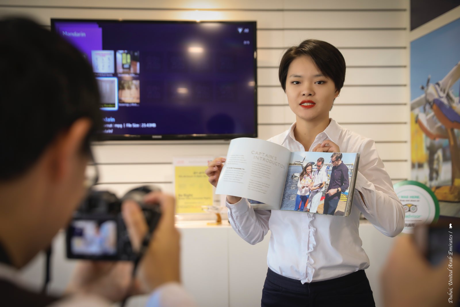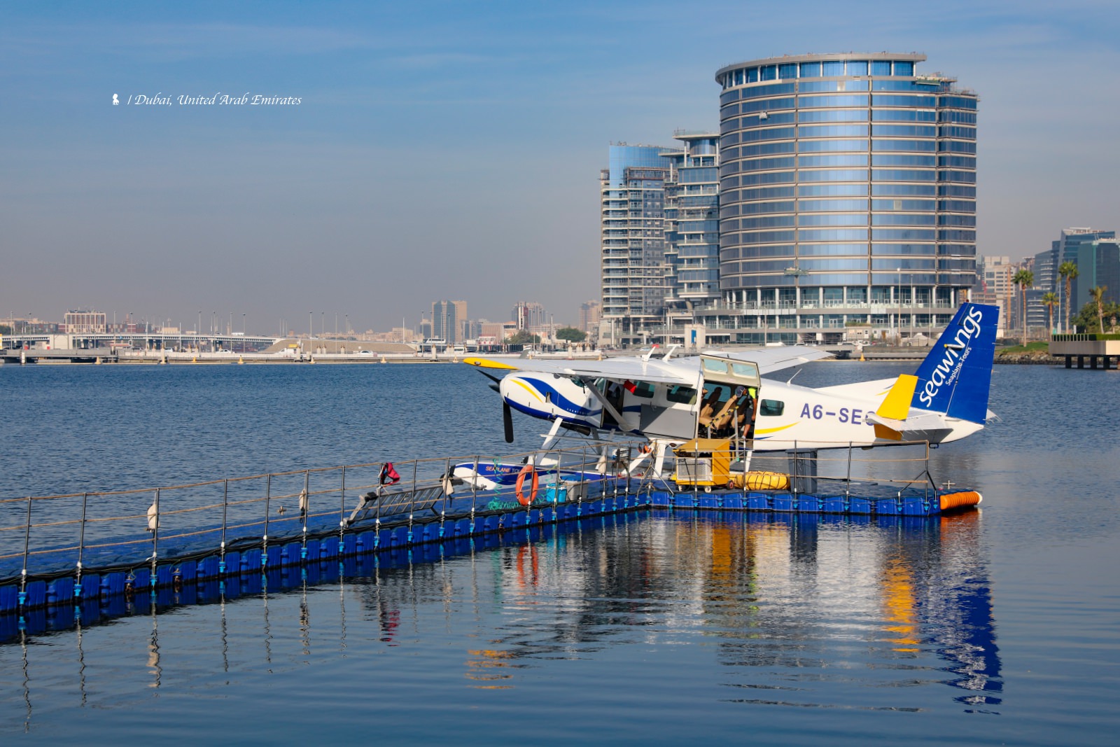 搭乘專屬派車,我們來到水上飛機公司 seawings 的辦公室,首先會有工作人員介紹本次行程並觀賞簡介影片,但整個過程我都心不在焉、因實在太興奮等不及要趕快到碼頭搭上水上飛機來空拍杜拜!使用的是 9 人座的 Cessna 208 Caravan 水上飛機,座位是兩排設計、每個位置都靠窗,不管坐哪一側都沒差,因為機長會很貼心,每個重要景點都輪流讓左側與右側乘客都看一次,就像之前看納斯卡線的小飛機一樣,不過還好是在杜拜這回沒像上次那麼催吐。