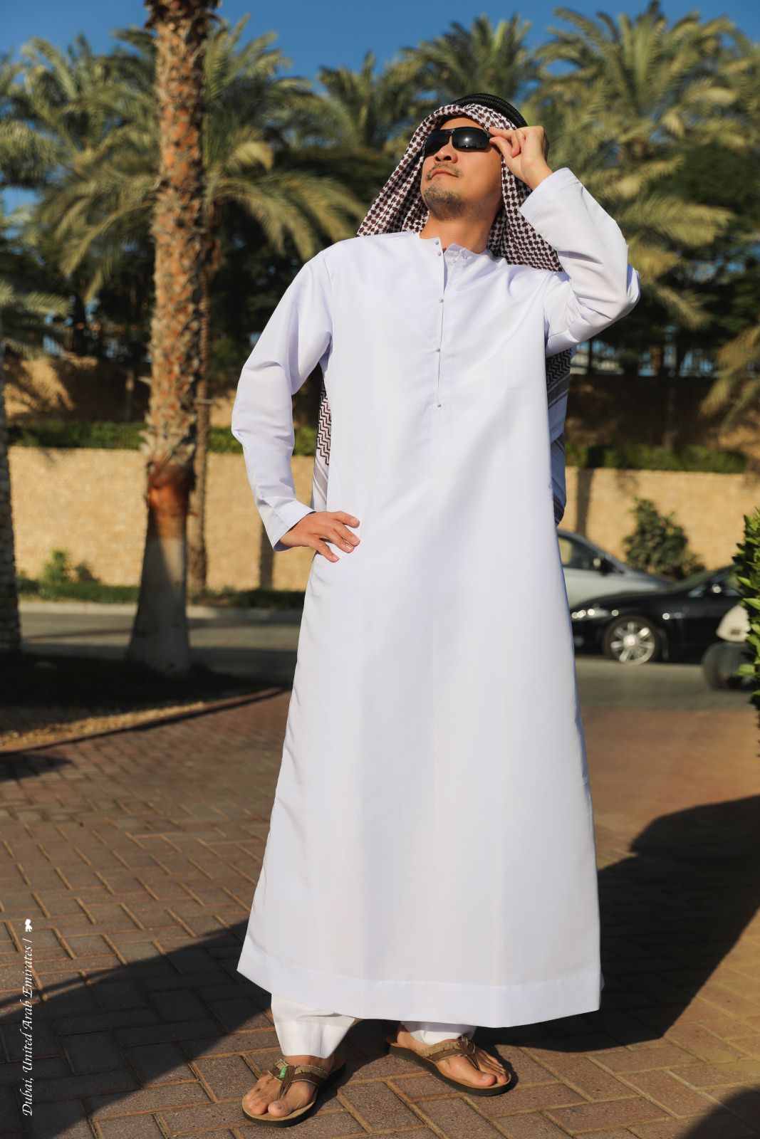 這幾年我陸續搭乘不少飛行器,如德國的齊柏林飛船土耳其的卡帕多奇亞熱氣球秘魯的納斯卡小飛機四川成都的直升機…等,但水上飛機還是頭一遭,終於藉由到中東搭乘「歌詩達地中海號」(Costa Mediterranea)的機會,預約停靠杜拜時的這項陸上行程。為了仿效油王搭乘水上飛機的氣勢,我與同行好友們「旅型男F4」約好這天高調的換上整套阿拉伯傳統服飾,從下郵輪集合開始,就引起不少注目眼光,甚至在碼頭還有當地女士要求與我們合影。