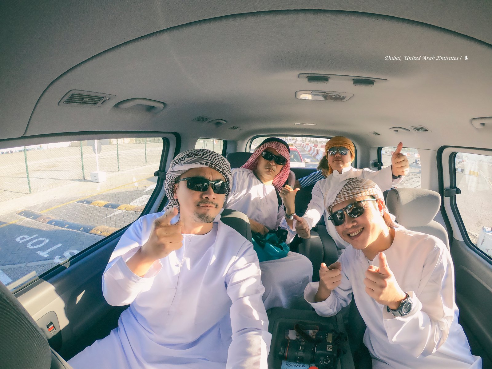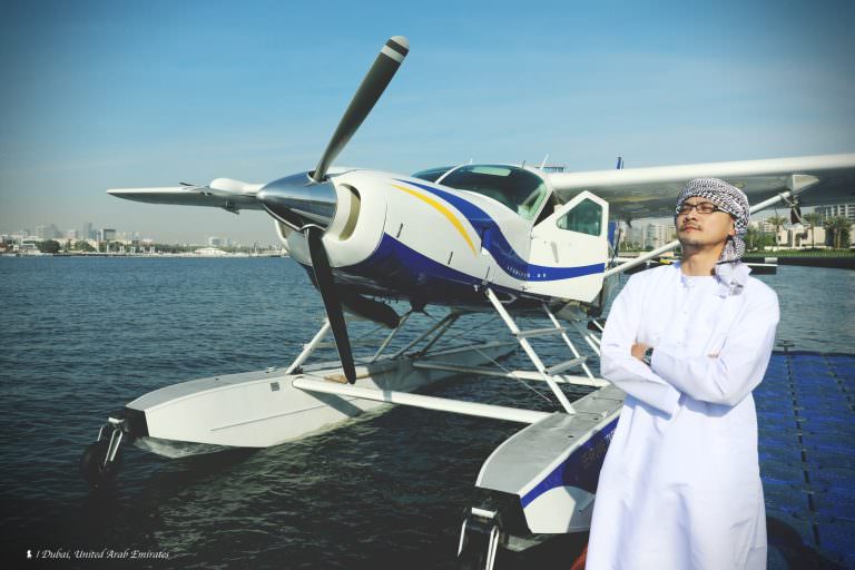 這幾年我陸續搭乘不少飛行器,如德國的齊柏林飛船土耳其的卡帕多奇亞熱氣球秘魯的納斯卡小飛機四川成都的直升機…等,但水上飛機還是頭一遭,終於藉由到中東搭乘「歌詩達地中海號」(Costa Mediterranea)的機會,預約停靠杜拜時的這項陸上行程。為了仿效油王搭乘水上飛機的氣勢,我與同行好友們「旅型男F4」約好這天高調的換上整套阿拉伯傳統服飾,從下郵輪集合開始,就引起不少注目眼光,甚至在碼頭還有當地女士要求與我們合影。