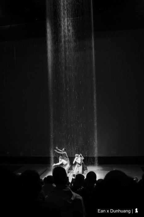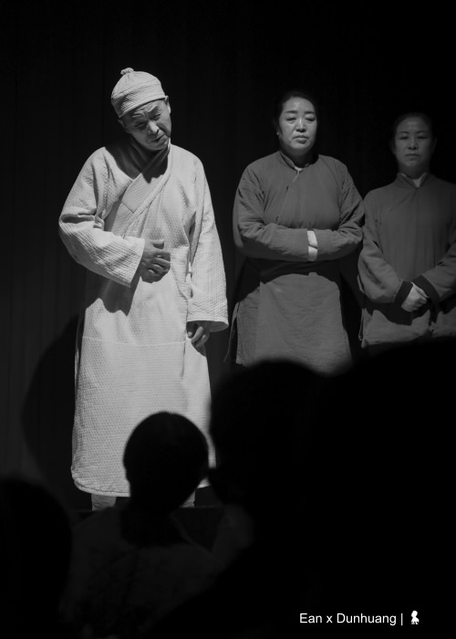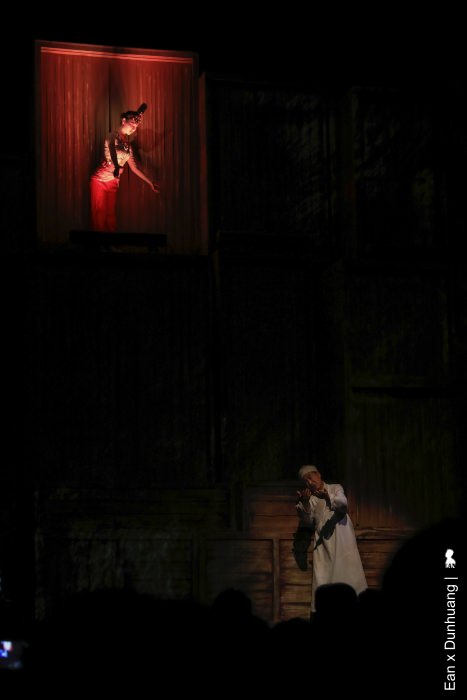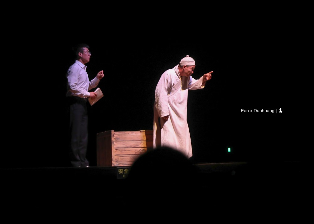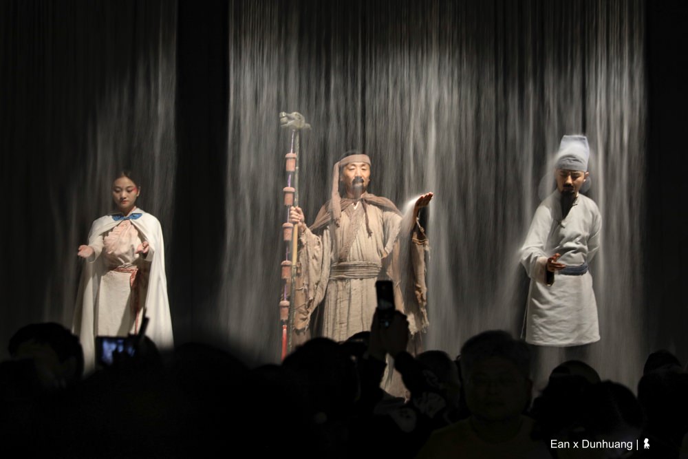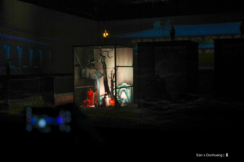 聽起來可能有點複雜,其實現場觀看馬上就能進入狀況,特別是王潮歌的劇,當音樂一下,馬上就讓觀眾進入到設定的情緒中。整齣劇以六個線索人物為脈絡、分別在五個場景講述橫跨千年的故事。帶著觀眾穿越時空一會兒是百年前、一下又回到千年前,從今生開始,一世世的回溯關於敦煌的過去,我用略帶戲謔的誇張形容,若敦煌是一個人,大概觀眾就是走動式的觀落陰。但有意思的是,王潮歌並沒有要重現敦煌悠遠的歷史,而是讓觀眾走進歷史,藉由劇中人物對話來引導著觀眾思考,以千年為刻度、宏觀的重新審視每個歷史上的單一事件。例如百年前,將莫高窟許多寶貝賣給老外的道士王圓籙,當時那個決定莫高窟命運的舉措,到底是對是錯?沒有標準答案,就看怎麼看。