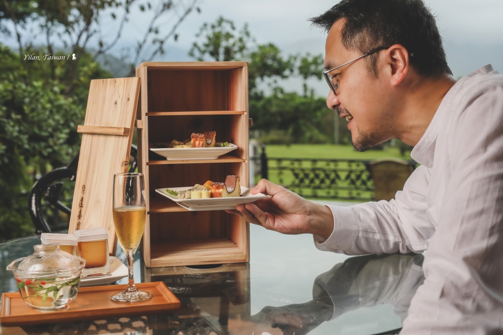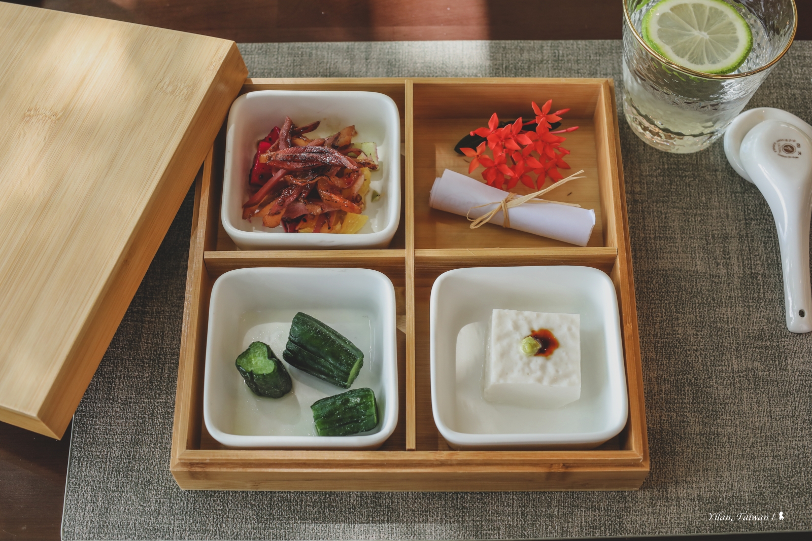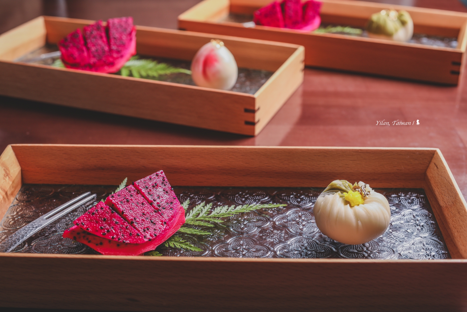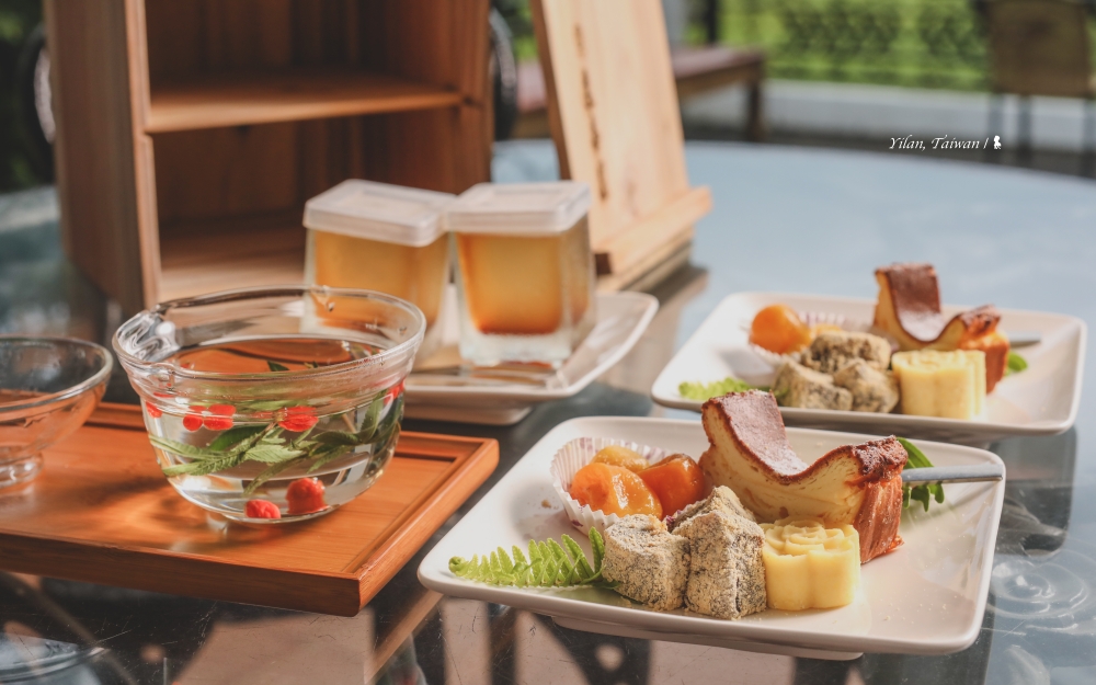 今年初的造訪(初訪的開箱文),讓我對美味餐食留下深刻印象,當時得知他們計劃會開一間對外營業的餐廳時,我就暗自期待著,這趟二訪可說就是專程為此回來。一回生二回熟,再訪已成了朋友,打從心底的喜悅能見到民宿的可愛這家子。中午刻意沒吃、要把肚子空出來給我很期待的晚餐,但車開到太平山腳要入住時,實在有點餓,剛好、迎賓下午茶讓我止飢。飲品,是我自己去園子摘芳香萬壽菊的天然花草茶,點心厲害了,被放在日式木盒裡,不只取用時能與其他住客保持社交距離,更重要是帶來驚喜。巴斯克乳酪蛋糕、綠豆糕、金棗、愛玉,這回還多了道新品,是民宿第一代主人許姐這早剛做的蕨餅,那是前陣子因疫情休園三個月,她利用時間去拜師所學,口感真好!疫情是考驗卻也帶來了禮物,眼前 Q 彈滑順的蕨餅即是。