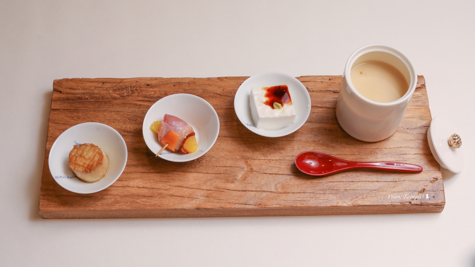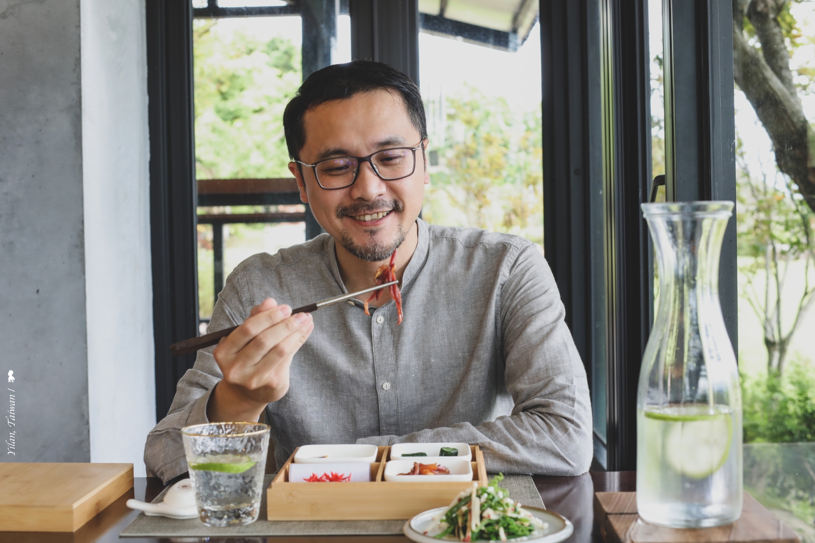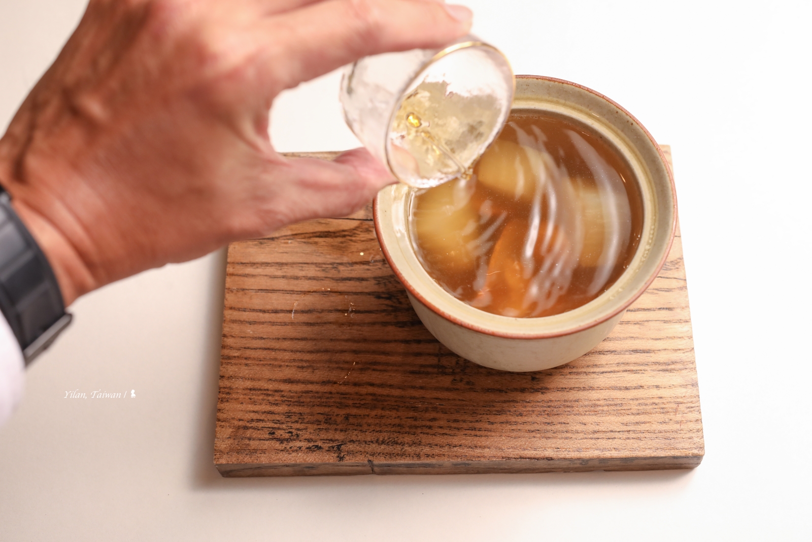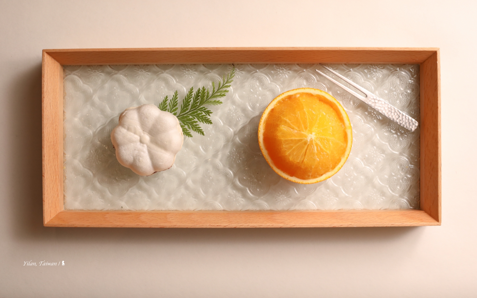 今年初的造訪(初訪的開箱文),讓我對美味餐食留下深刻印象,當時得知他們計劃會開一間對外營業的餐廳時,我就暗自期待著,這趟二訪可說就是專程為此回來。一回生二回熟,再訪已成了朋友,打從心底的喜悅能見到民宿的可愛這家子。中午刻意沒吃、要把肚子空出來給我很期待的晚餐,但車開到太平山腳要入住時,實在有點餓,剛好、迎賓下午茶讓我止飢。飲品,是我自己去園子摘芳香萬壽菊的天然花草茶,點心厲害了,被放在日式木盒裡,不只取用時能與其他住客保持社交距離,更重要是帶來驚喜。巴斯克乳酪蛋糕、綠豆糕、金棗、愛玉,這回還多了道新品,是民宿第一代主人許姐這早剛做的蕨餅,那是前陣子因疫情休園三個月,她利用時間去拜師所學,口感真好!疫情是考驗卻也帶來了禮物,眼前 Q 彈滑順的蕨餅即是。