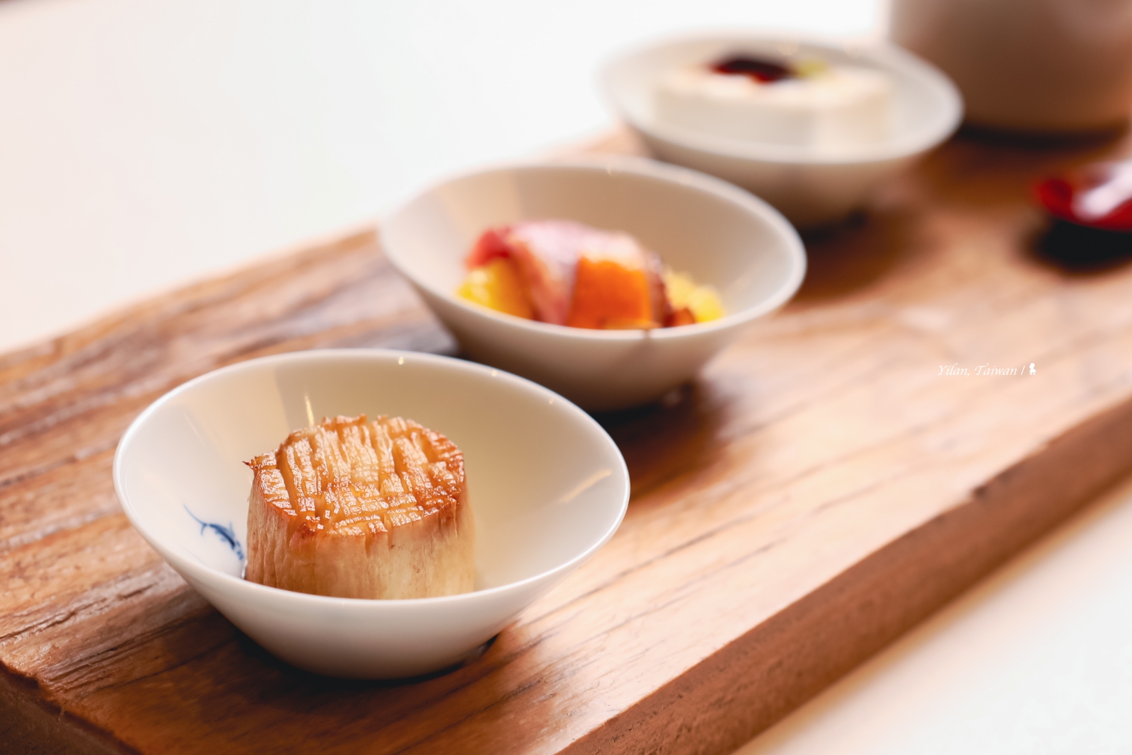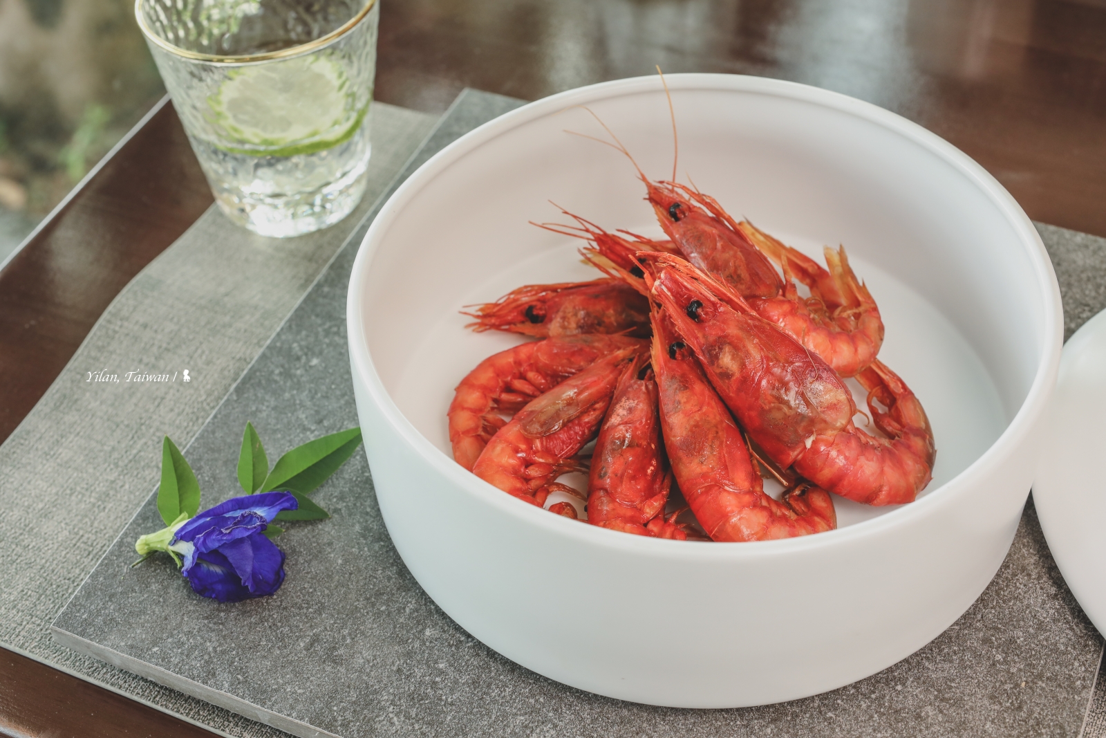 午餐採套餐形式,目前每周五到一提供。價格視所點的主菜而定,680 元起跳,我感覺很值得,不管是用紙包的東北角新鮮透抽、皮烤脆口的舒康雞或 Prime 等級的無骨牛小排,都很具水準!若喜歡吃蝦,不要錯過蝦味濃郁的胭脂蝦,而最後登場的甜點也不簡單,是許姐親自手作的金箔和菓子,搭配宜蘭地產很甜的火龍果,讓人滿足!若是房客前一晚有享用過晚餐,Howard 還會很貼心的在菜色上做變換,以避免嚐到重複的料理。