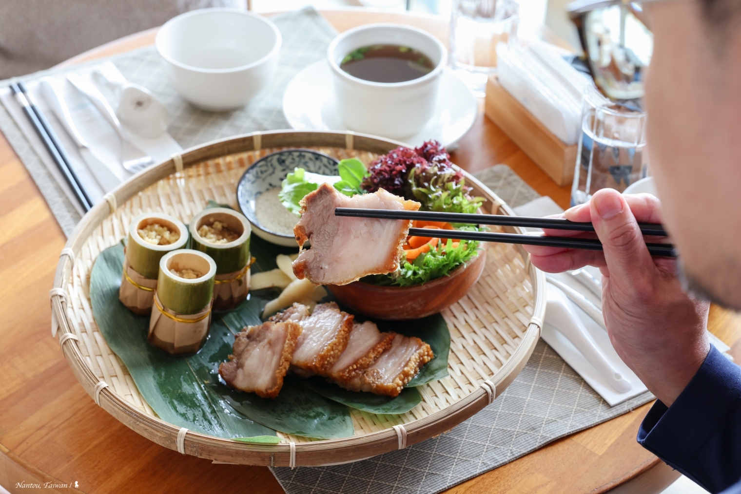 ⇑ 中午也可在大廳酒吧點餐,我點了「丹彤原民風味餐」,裡面有新鮮的野菜沙拉、五花肉及竹筒飯還附了碗湯,口味蠻不錯