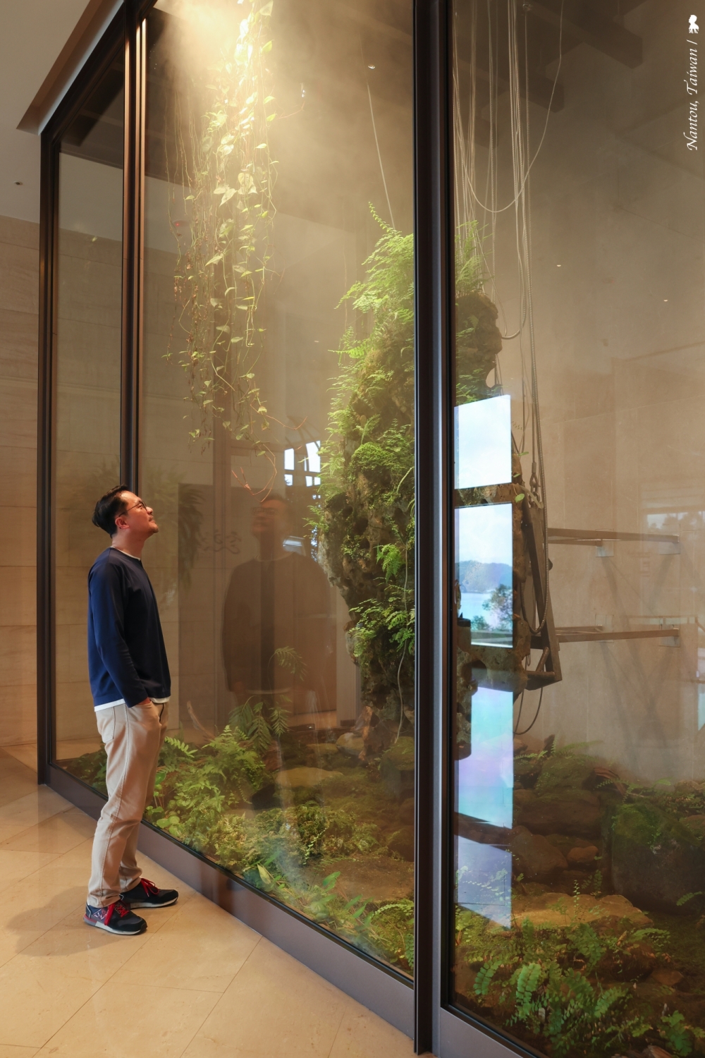 每天早上 10 點到 11 點,走在公共空間不妨閉上眼睛認真聽一下,那有點不尋常像是答答答的聲響,是全館正播放擷取苔癬的信號聲,聲音是來自一樓大廳取名「石倚煙」的生態缸,透過裡頭「苔蘚」導電的概念讓植物與住客對話。而另一個生態缸「花染木」也很有趣,裏頭生長的植物說單一也很多樣?因為裡面放了 19 種秋海棠,包括台灣 3 個特有種,而秋海棠的花語是 “相思、誠懇、親切”,雲品也藉此傳遞所要傳達的服務精神與態度。原本以為就只是兩座漂亮的巨型造景,沒想到藏有這麼多故事,真的是一葉一世界,若有興趣也可打開手機掃描生態缸上的 QR Code,即可聆聽完整介紹。
