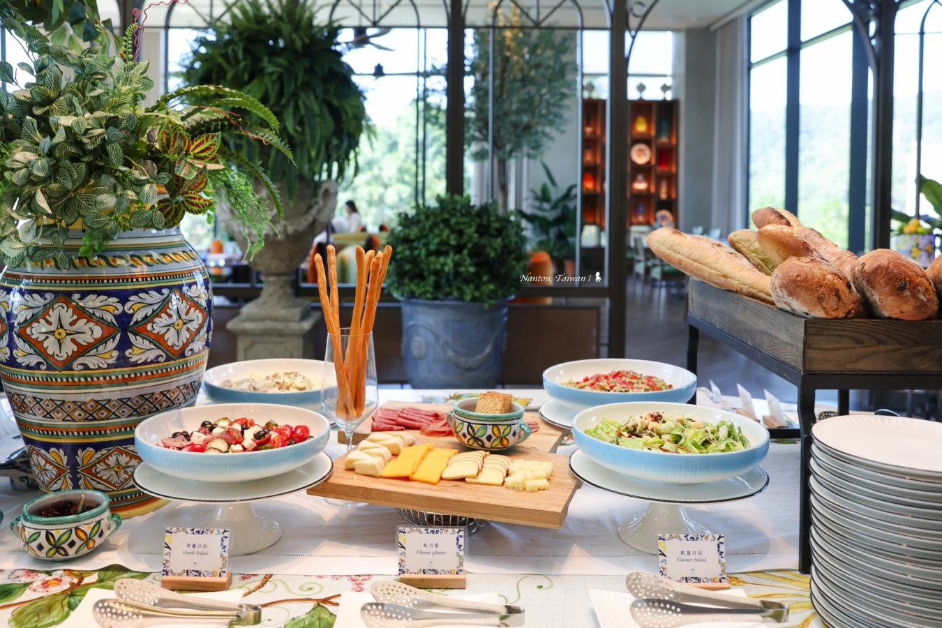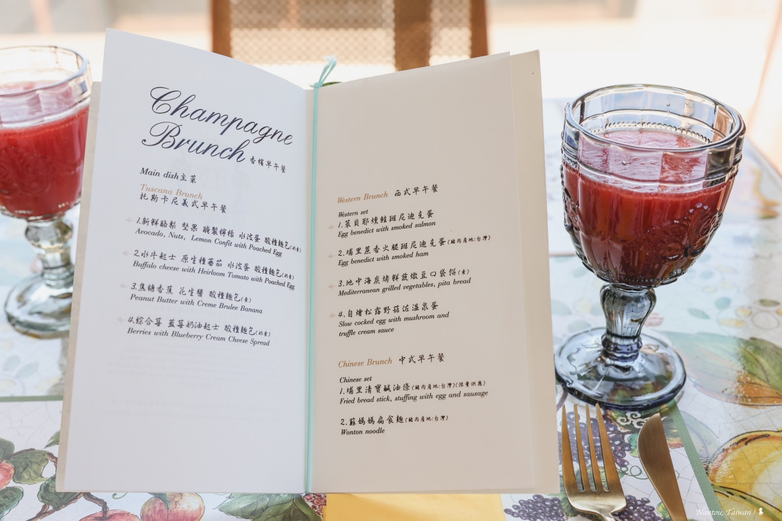 週日上午 10:30 到下午 14:00 會奢華提供「香檳早午餐」,除了一樣採位上的單點服務外,還額外在美麗的進口花桌上提供多樣餐點,不管料理或擺飾都深具美感,沙拉、麵包、水果,一旁還有香檳與義大利紅白酒皆可自由取用。生蠔、魚子醬、酪梨水波蛋…除了讓人食指大動的歐式美味,菜單上竟還提供埔里在地人氣早餐「埔里清寶鹹油條」與「蘇媽媽扁食麵」,非常用心!