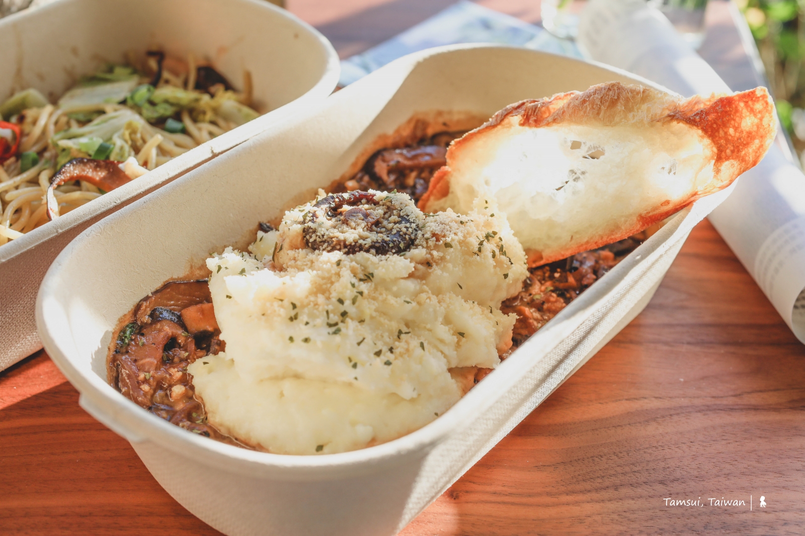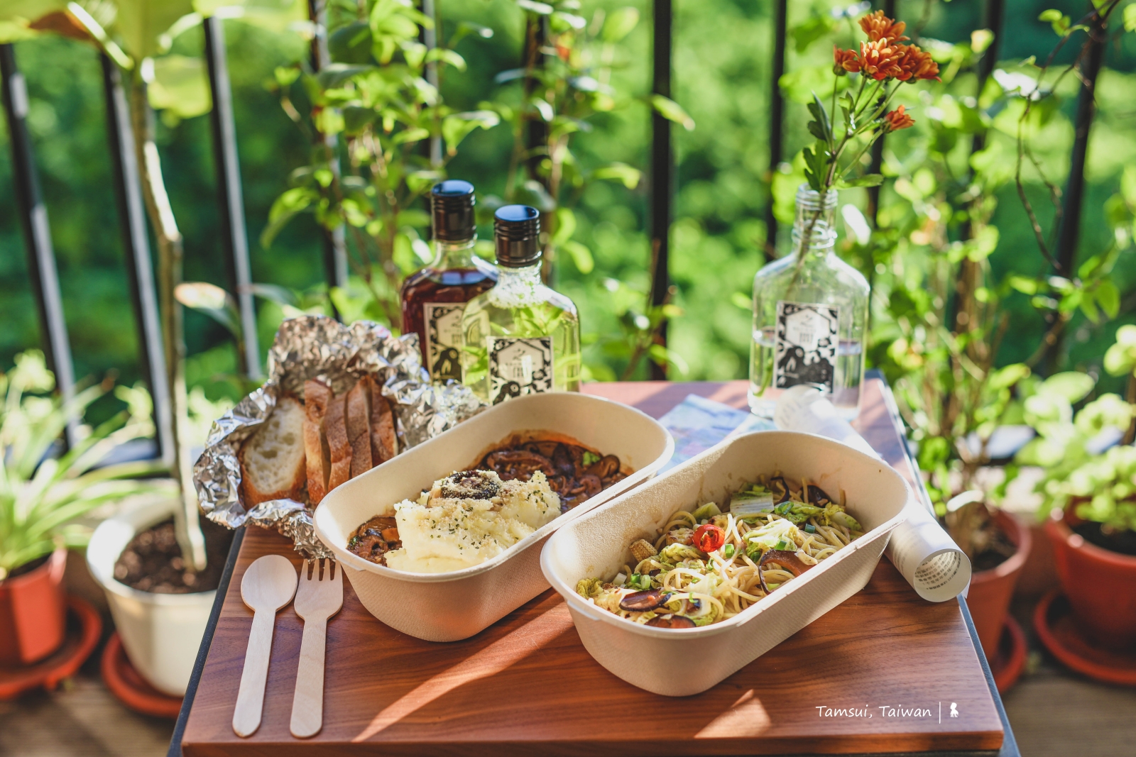 淡水的之間 茶食器即日起(2021.7.17)起推出週末限定的外帶兩人份「散散步之間套餐」,內容有招牌的「法國麵包佐黑胡椒薯泥」與三款義大利麵擇一,以及藍莓醬烤乳酪蛋糕,兩瓶消暑冷飲是用他們自己種的香草去冷泡的蜂蜜包種茶和冰咖啡。