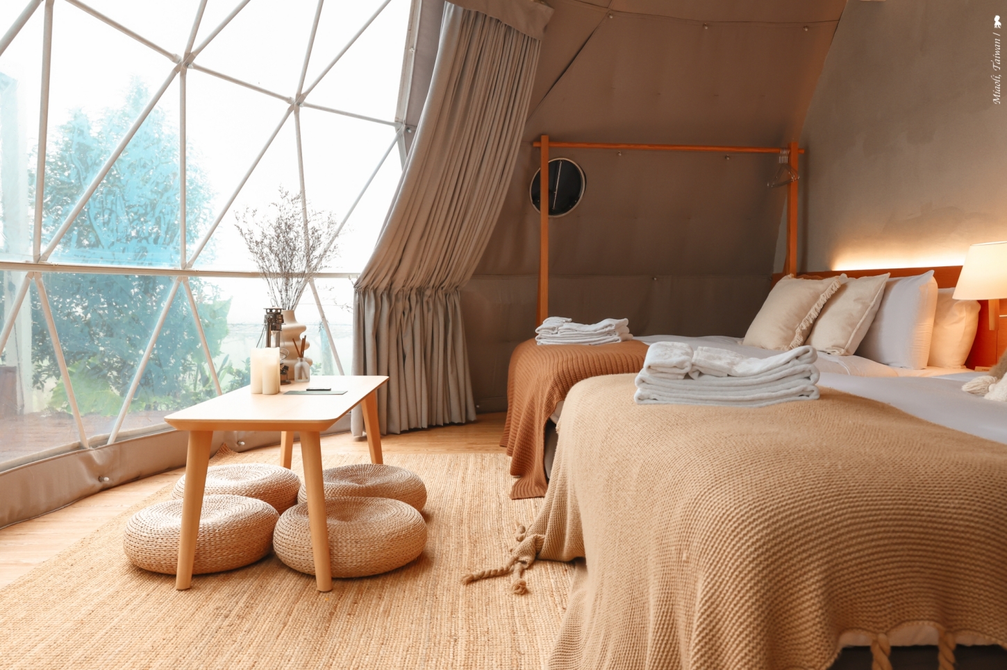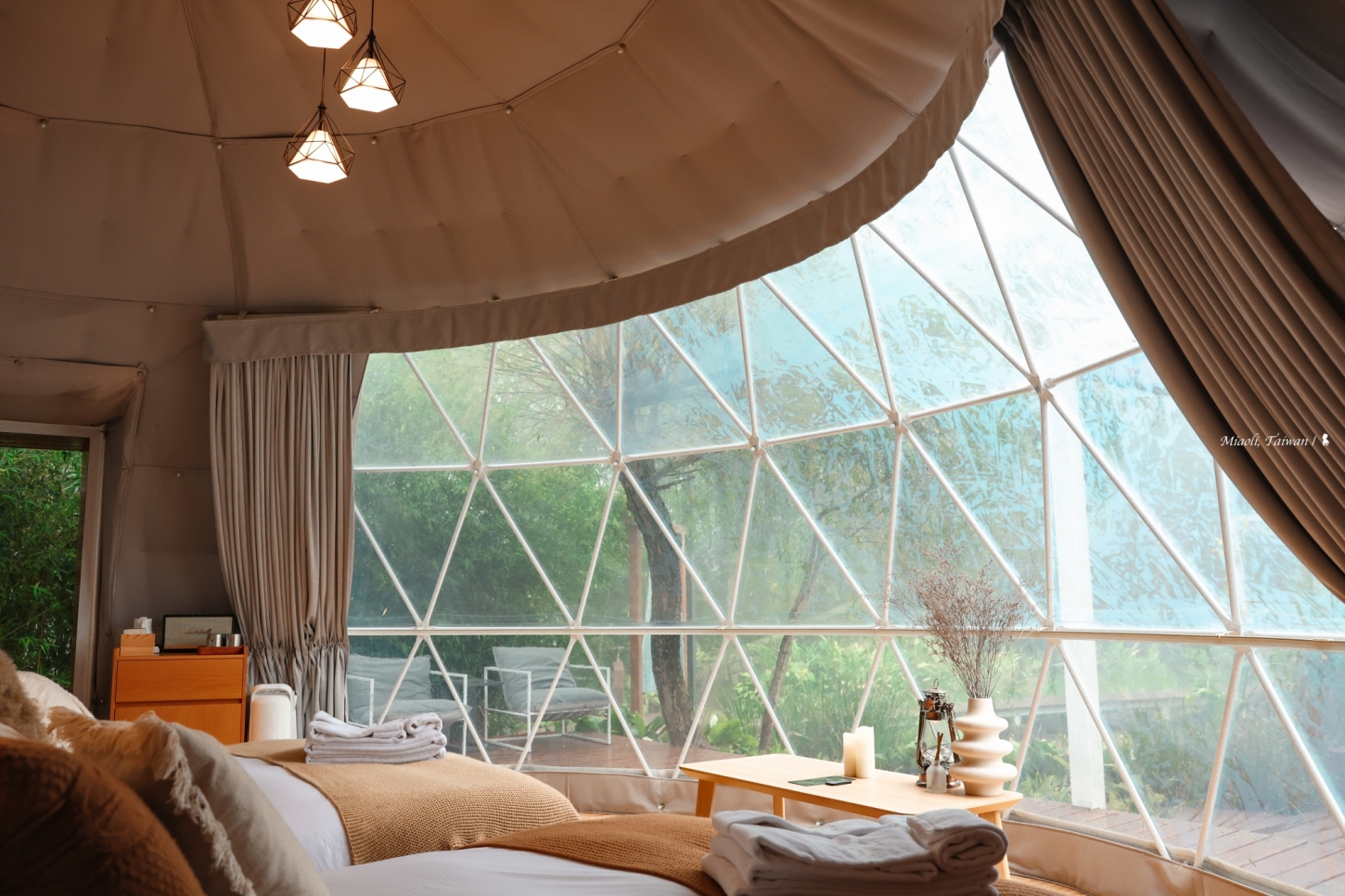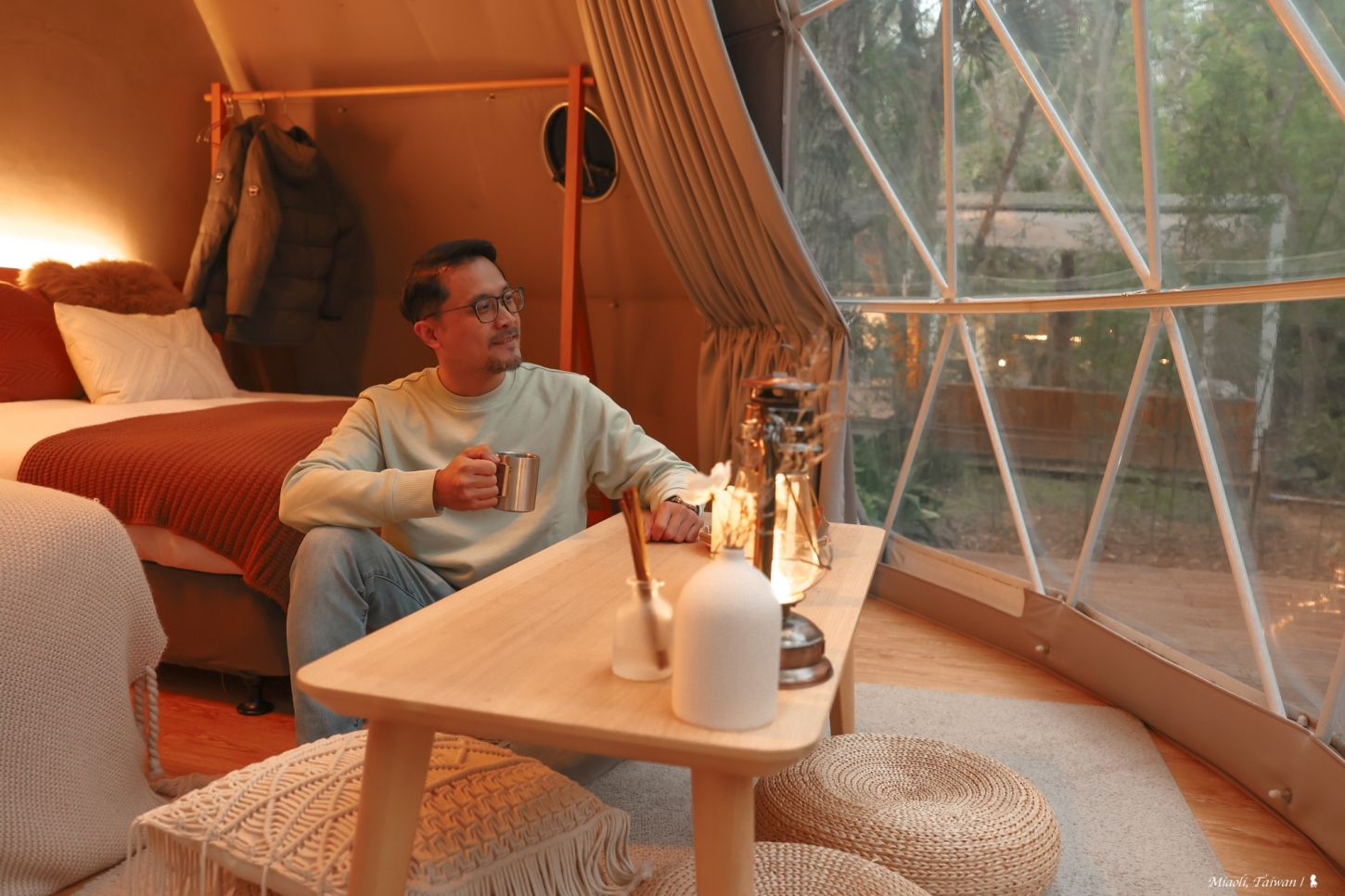 收費:山野森活每頂球型帳篷皆配有兩張雙人床、至多可睡 4 人,以人頭收費,一律提供豐富的 4 餐,雙人價格視入住為平日或假日:NT$ 16900-19900,4 人入住價格在 NT$ 28900-31900。若是 60 天前訂可享平日早鳥價。