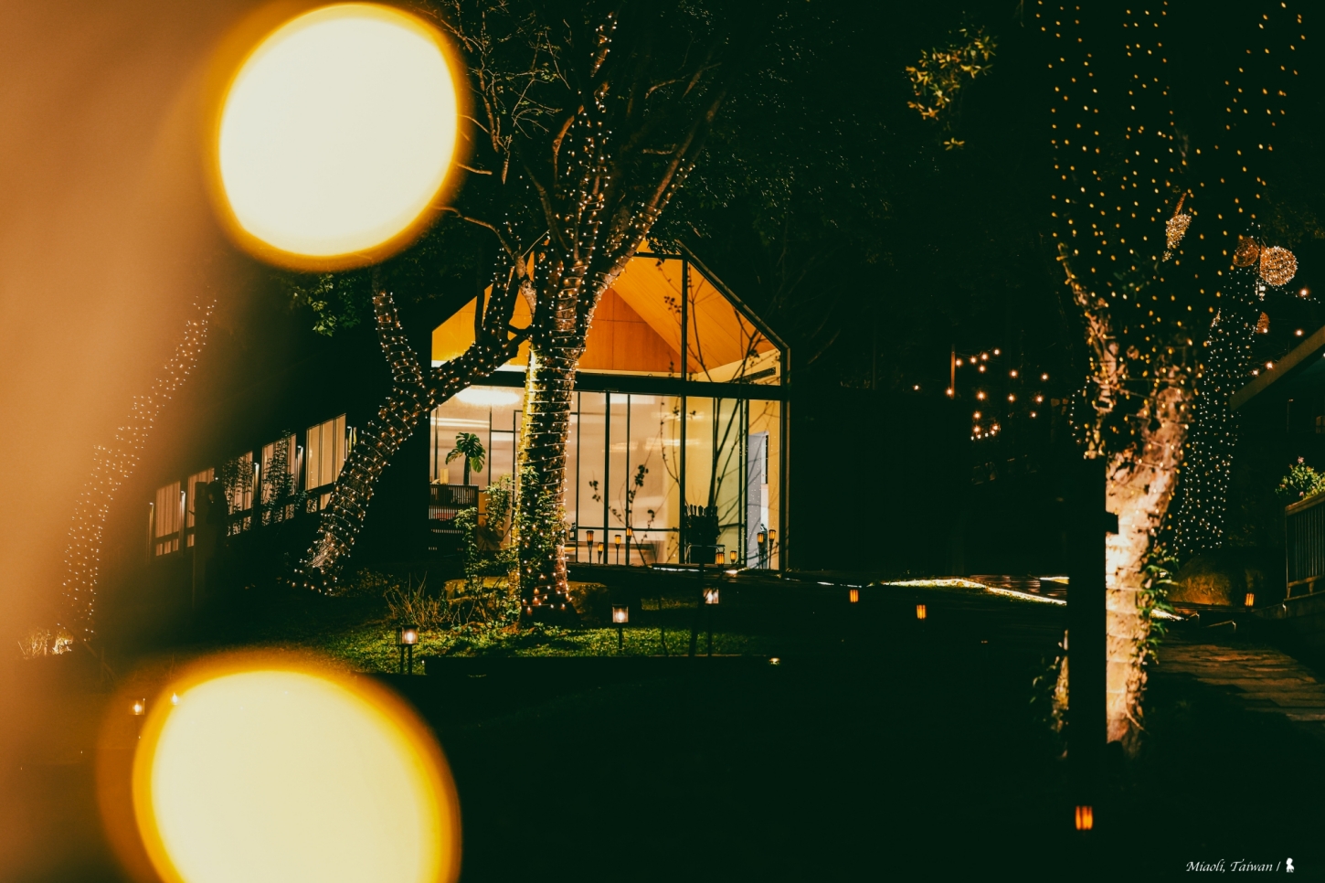 晚餐,是在一間線條俐落的透明感建築裡,就規格,已是間正式餐廳,夜裡點了燈成了一只盒子發光著,傍晚我走在燈泡夾道的樹林,不知為何,那讓我想起了徐志摩筆下的翡冷翠,亮晃晃的好浪漫。曾在知名渡假飯店掌勺的主廚,融入了客家在地元素及食材,又加了一些國際元素像是紅色的瑞士起司鍋,主餐則是日本 A5 和牛,熟度掌握的相當不錯,再提供好品質的白酒及紅酒佐餐,露營能享用這樣一頓完整的創意料理,確實奢華。