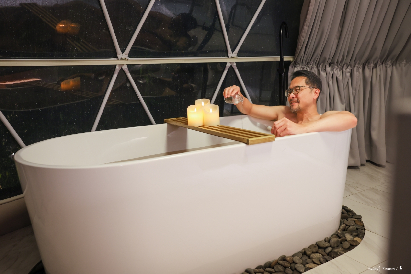 午夜前的檜木純露泡澡:園區熱水供應時間到 12 點,我抓緊時間在這之前把浴缸水放滿,先放了園方準備的檜木包,再倒入檜木純露,實在有夠奢華的這池檜木澡。