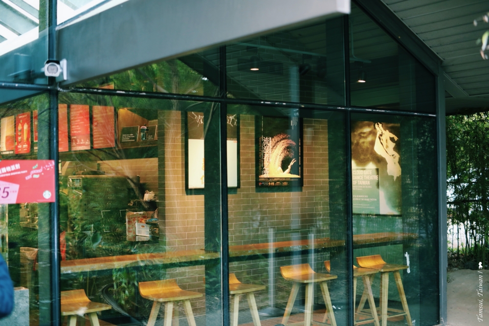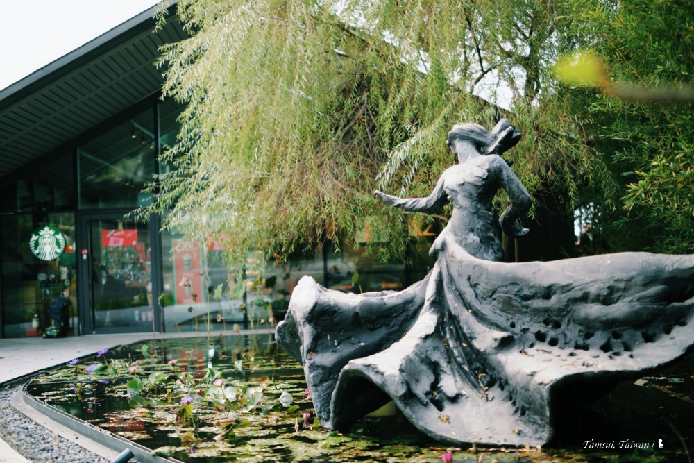 體驗結束後,手上的識別環先別急著丟,可到旁邊的星巴克淡水雲門門市享有特別優惠,這間星巴克如玻璃花房,裡頭還掛著雲門的幾張舞碼海報、是全台 500 間星巴克門市唯一。仔細看,裡頭還有個與雲門有關的巧思,是吧台前方的椅子如河水蜿蜒,上寬下窄的設計,希望營造視覺上的輕量感,如雲一般的輕、如舞般的律動。此外,每位遊客一定會注意到門市外綻放的荷花池與一座青銅雕像,那是紀念雲門舞集第一代舞者藝術總監 – 羅曼菲,曾經,林懷民老師為她編作的「輓歌」裡,她以近十分鐘不斷的旋轉震撼觀眾,雕塑家林健成將其舞影鑄作雕像取名「旋的冥想」,飛舞的裙上有很多孔洞,那不是要抗颱風,而是隨著陽光挪移會讓投射的影子移動,彷彿旋轉未歇,持續把感動留給世人。