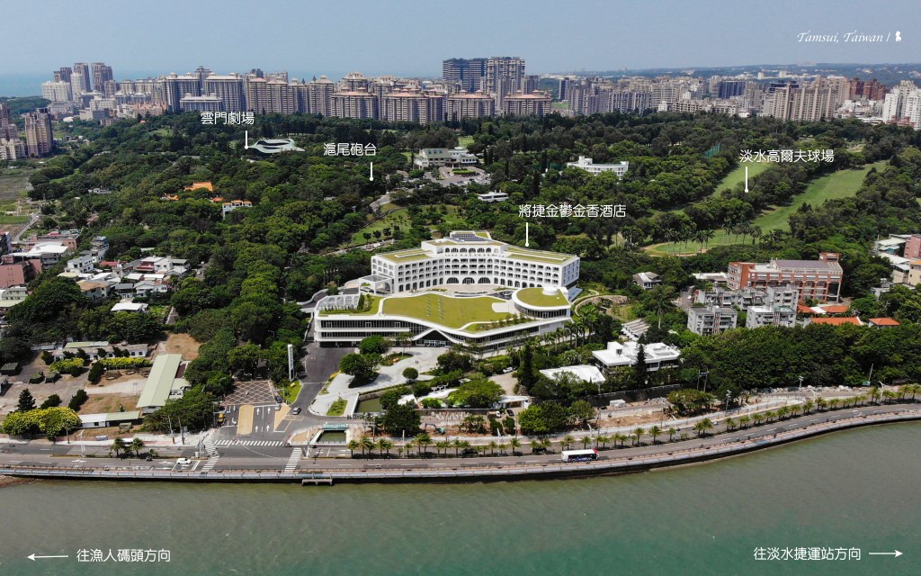 ⇑ 酒店座位在人文薈萃的淡水河畔,如照片標示,緊鄰淡水高爾夫球場、滬尾砲台及雲門劇場,一滴水博物館也僅數步之遙