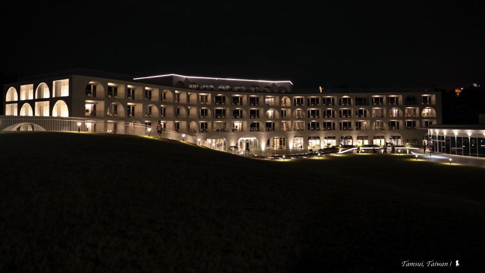 因為這間酒店,淡水的夜,從此變得不同。我很欣賞入夜後園區的照明設計。建議沿著水流、順著坡度草皮走上走下的繞行一圈,回頭看,當視線不只酒店建築,近如被暱稱為淡水四大金剛的海景園中園、遠如大屯山小坪頂上的人間燈火,都被框在視窗裡,會發現這園區與周邊環境竟融合的如此恰到好處。眼前這棟採用拱形元素如宮殿般的白色建築,像三百多年前歐洲人在淡水留下的印記,彷彿就快能聽見當時人們欣賞眼前這片美景所發出的讚嘆。