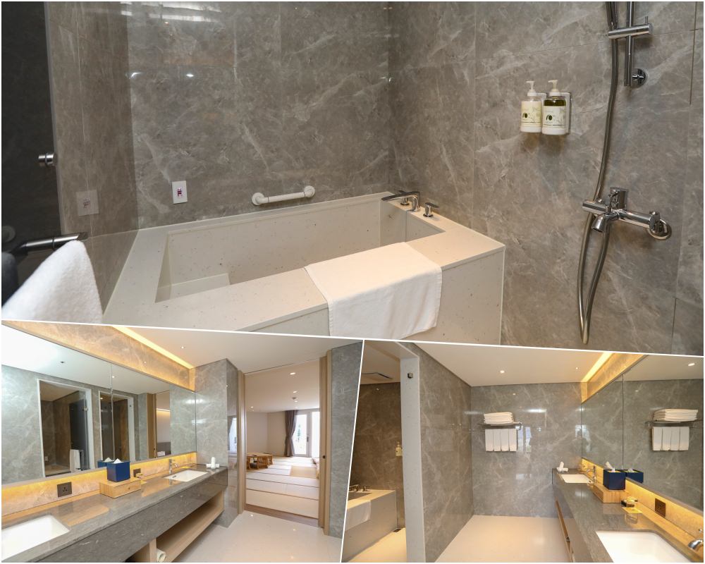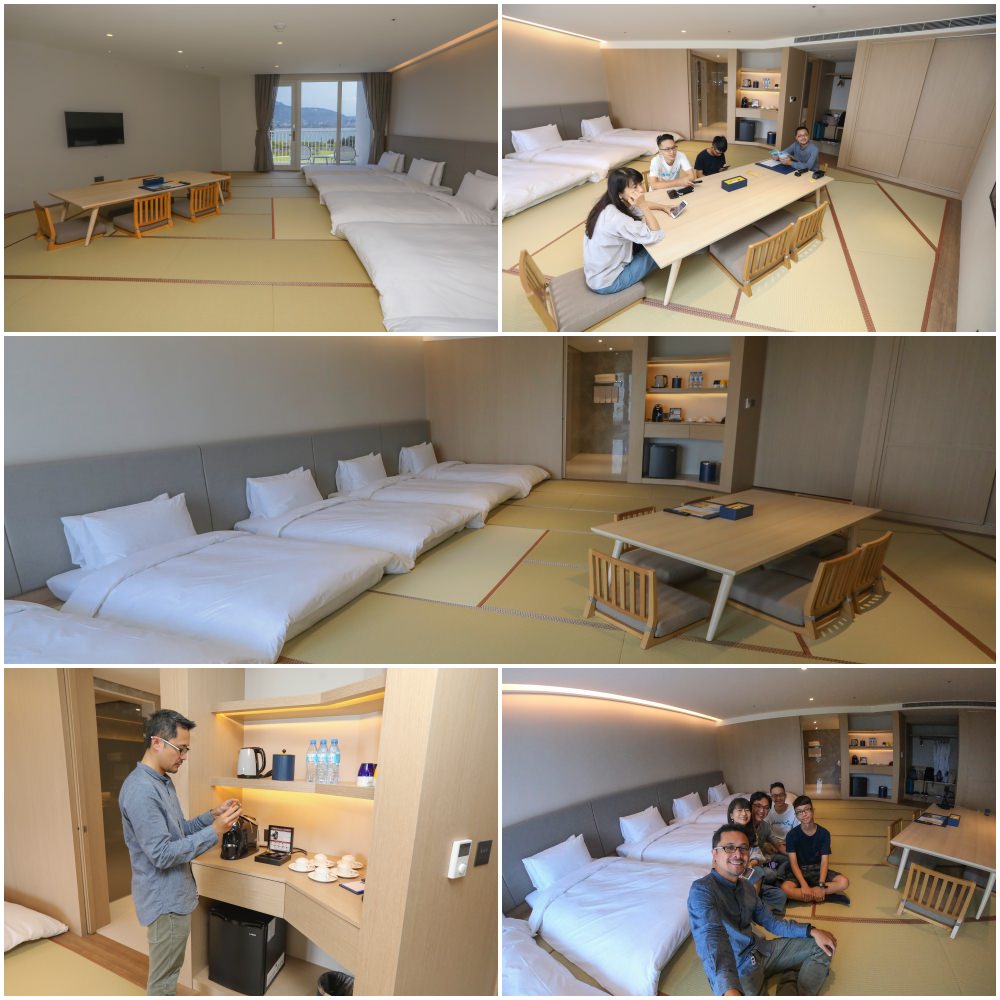 期待這間淡水最新飯店許久,哪能等到正式開幕才來一探究竟!趁著老哥一家北上來玩,趁還在試營運相揪一塊搶先體驗。酒店有 5 種房型、共 175 間房,喜歡睡榻榻米的我,特別指定日式套房,房間非常大,有 23 坪,超好滾,這樣的房型全館只有 3 間。入住時飯店尚在試營運中,新到我撕開了房間膠囊咖啡機的膠帶,成為第一組使用的客人 !很貼心的是全館不分房型、所有房間都配有浴缸,只不過日式套房更好、給的是個大浴池,我特別準備從法國阿爾卑斯山帶回來的檸檬草泡澡精,讓大夥輪流泡澡,實在享受!這間浴室明亮寬敞又是雙洗手台,我很喜歡。