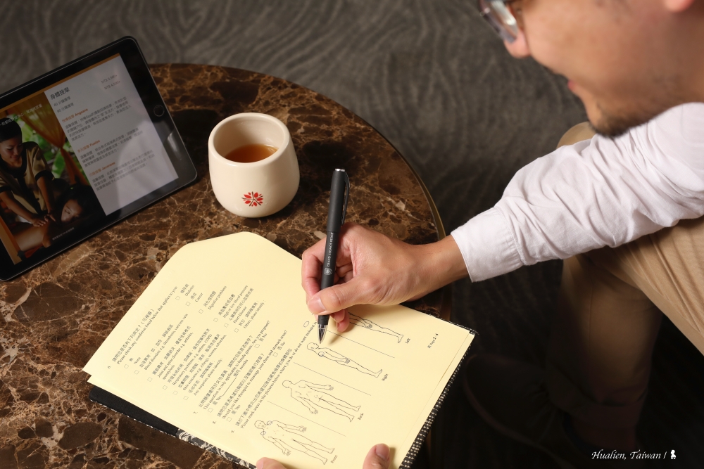 為打造國際級的渡假園區,在開幕之初,瑞穗天合就領全台之先,引進了悅榕集團旗下的悅椿 Spa(Angsana Spa),讓房客不用出國,在花蓮的好山好水,就能體驗世界頂級的 Spa 服務。去年旅行馬爾地夫與中越都入住了悅榕庄,當時館內 Spa 都成了我難忘的旅行回憶,趁這次入住早早就預約好,不光是要來享受更是回味。悅椿 Spa 位於休閒會館的 3 樓,佔地蠻大、共有 11 個按摩房,我一走進來,是熟悉的味道與氛圍讓我滿足的微笑著。跟在國外一樣,他們送上迎賓毛巾與茶後,會細心詢問想要與習慣的按摩力道與方式,包括使用精油與否,接著會推薦幾種符合所需的療程做選擇。我選擇是力道較重、會使用精油的「爪哇按摩」療程。接著,一樣會提供一份健康與身體不適詢問單,包括是否介意按摩包括腹部與胸部等較隱私的身體部位,以及在身體示意圖上圈選表示要加強的部位,若要避免被接觸則在部位上打叉,這是悅榕 Spa 的標準流程,只是這回表單多了親切的中文。
