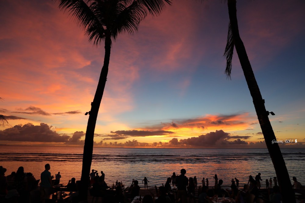 說到蝦趴,這回在關島可真帥了不只一波!我開著全關島唯一的迷你粉紅色敞篷車,趁著黃昏晚風,開往週三限定飄香的查莫洛夜市,這台車開在路上很難不被注意,那就大方的把蓬敞開、盡情享受難得的注目禮吧!關島傍晚,非常容易出大景,除了夜市旁的碼頭,在杜夢灣區的槍灘(Gun Beach),也是另一處欣賞日落晚霞的絕佳景點!推薦 The Beach 沙灘吧,大啖美食的同時還能一邊欣賞老天爺的天空作畫,每每在這我總看得目瞪口呆,驚嘆不已。