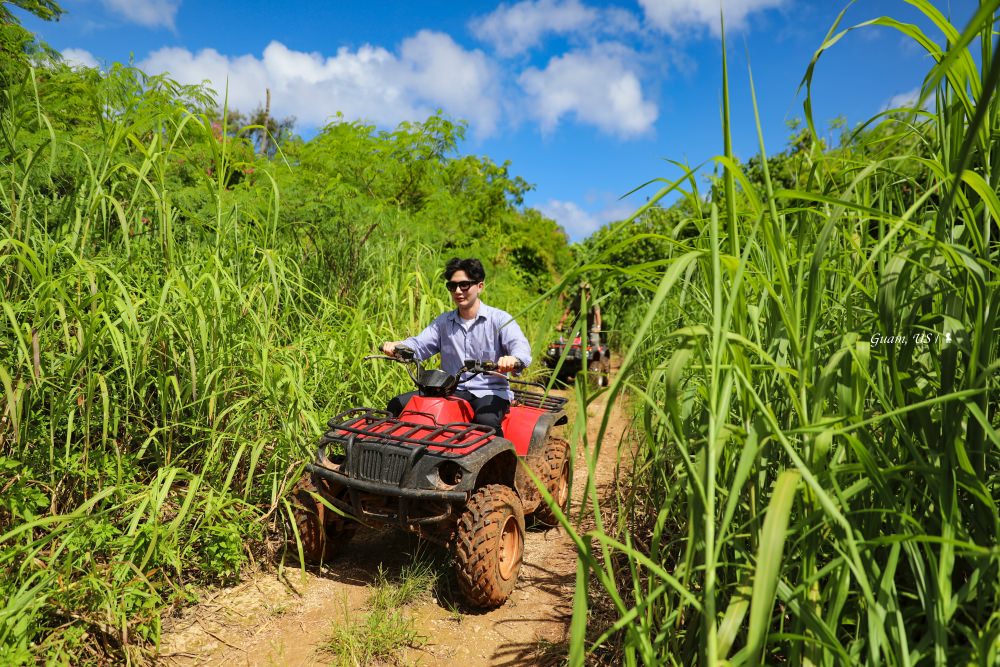 關島,距離台灣最近的美國屬地,常年如夏,不管哪個季節前來都能享受豐沛陽光!儘管我已造訪這座迷人島嶼多次,但每次再來,除了看不膩的碧海藍天,總都能有新鮮事等待著,讓我樂此不疲。除有先前體驗過兩次的高空跳傘(延伸閱讀:告別青春前的極限一跳,高空跳傘在關島),這回再來,同樣也是上山下海、玩得帶勁又蝦趴!上午來到知名景點戀人岬附近的叢林,首次體驗了四輪驅動沙灘車,在 Blue ATV 老闆的帶領下,我開始一段睜大眼睛的越野之旅!不管是有著不小的高地落差或窟窿積水,都帶著氣勢的騎過去,讓跟在後頭的我是瞠目結舌,另外也要睜大眼睛看的是,樹林裡的蝴蝶超多,非常美!