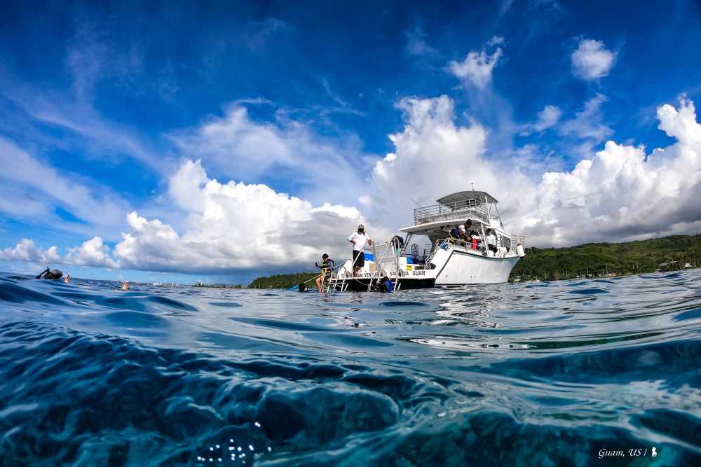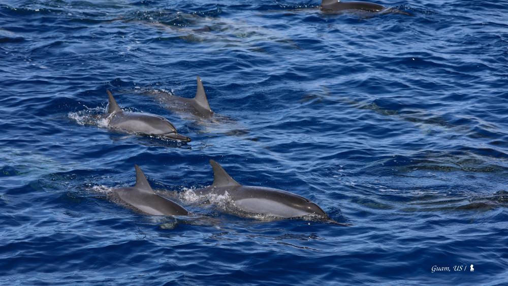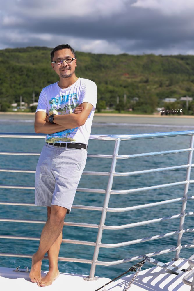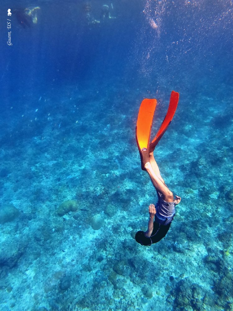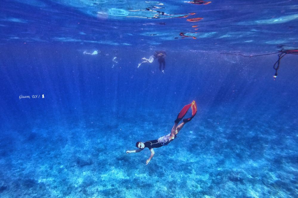 下午搭船出海賞豚去,原本沒抱太大期望,沒想到十多隻海豚緊靠船一起悠遊,最後我們要駛離,海豚們接續飛騰出海面像在道別,直呼驚喜!看完海豚,緊接船會開到擁有美麗珊瑚的海域讓遊客浮潛,但我沒口咬呼吸管,而是穿上長蛙鞋首次體驗自由潛水,憋口氣踢幾下就能下潛數公尺,光束在水下的折射極美,藍綠在此和諧的宛如琉璃海。Guam Star Sand 遊艇的服務不錯,不僅會準備汽水、果汁與啤酒,最後還端出生魚片讓大家在船上嚐嚐海味。