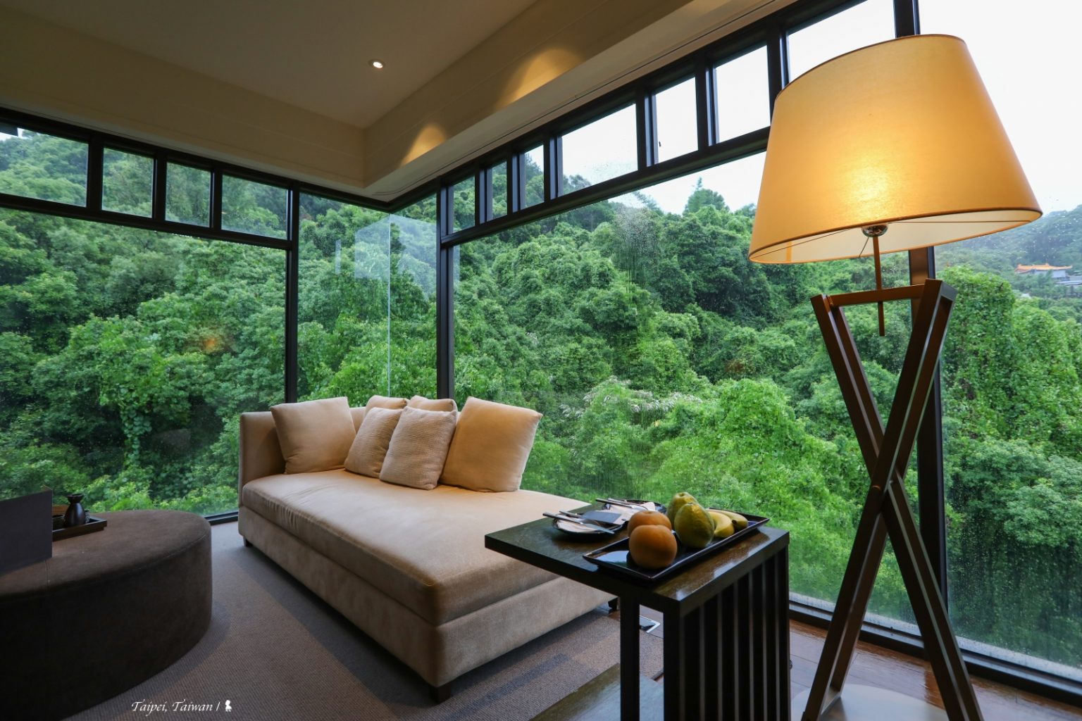 我只能說北投麗禧心機真的有點重呀!客人進房時,故意把窗簾都先拉上,為的,就是要等客人自己拉開時,打從心底「哇~」的大驚一下! 我這回入住的是該飯店第二高級房型「幽雅精緻套房」,因位於邊間,小客廳擁有視覺震撼感十足的 270 度綠樹環景,入住時颱風雨還正下著,但完全不掃興,反而讓窗外的樹,更綠!