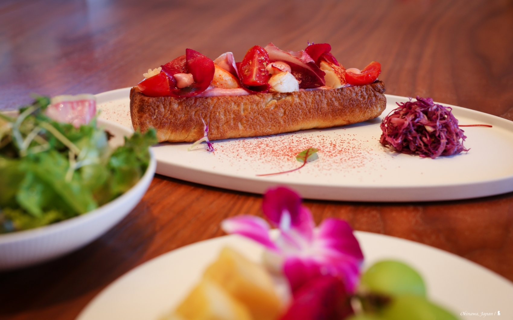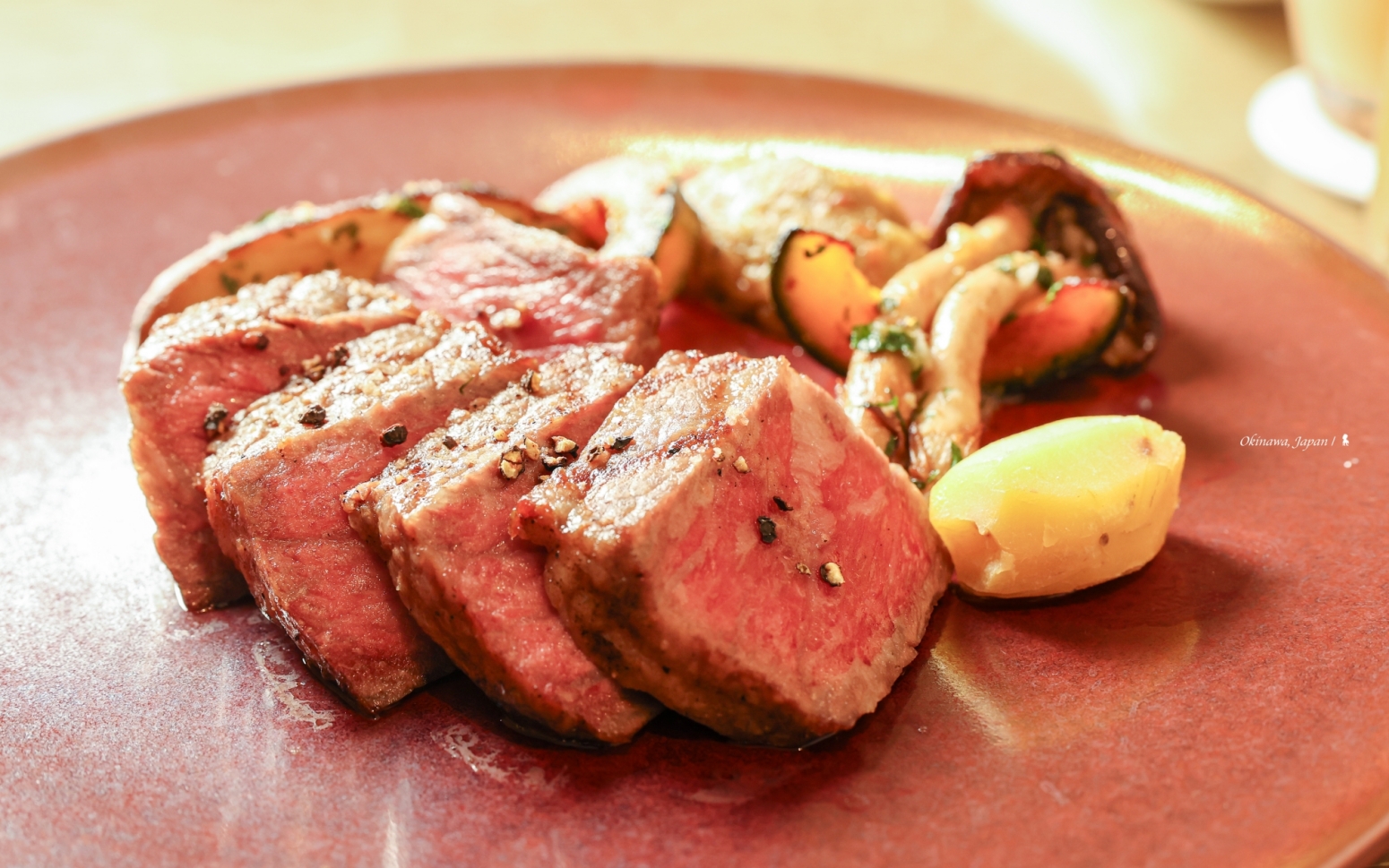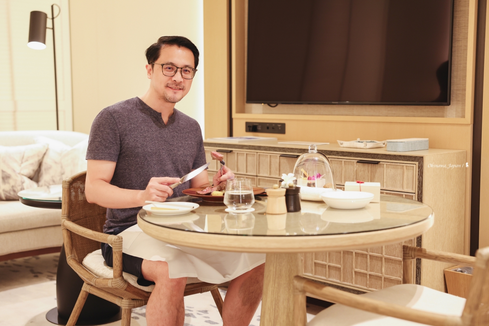 入住沖繩海麗客蘭尼所享用第一餐就讓我大為驚艷。 因班機延誤,錯過全日餐廳「House Without A Key」的最後點餐時間,所以送至客房當宵夜,也正好舒適的體驗客房服務。我點的是用備長炭烤的日本國產牛腰脊肉,非常美味,好肉質搭配有火候的烤功,送一塊入口就讓我忘記舟車疲憊,成為這趟飯店美食之旅的完美開端,並對接下來其他間餐廳充滿期待。