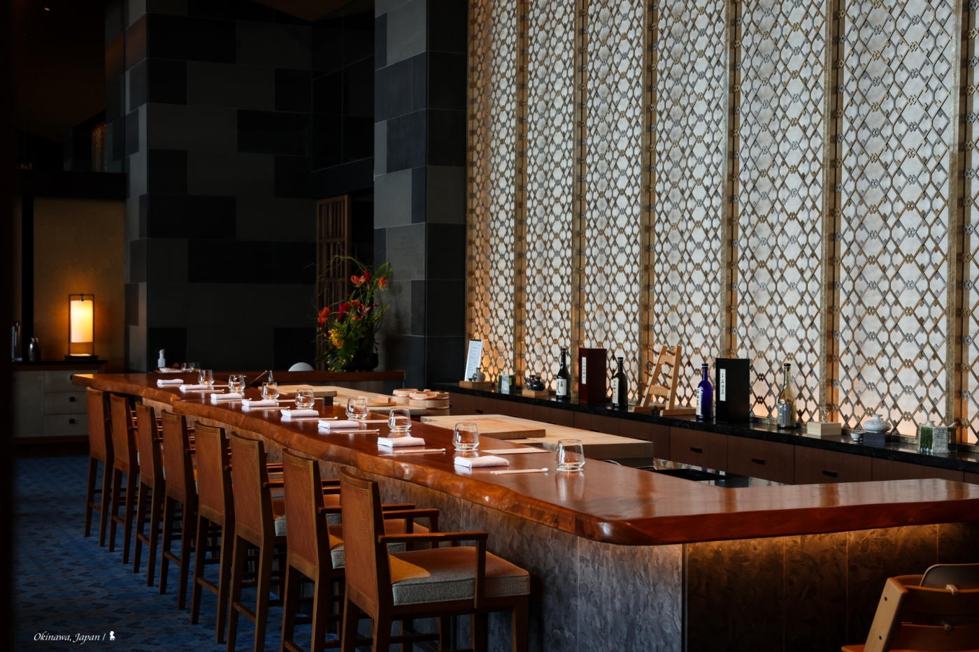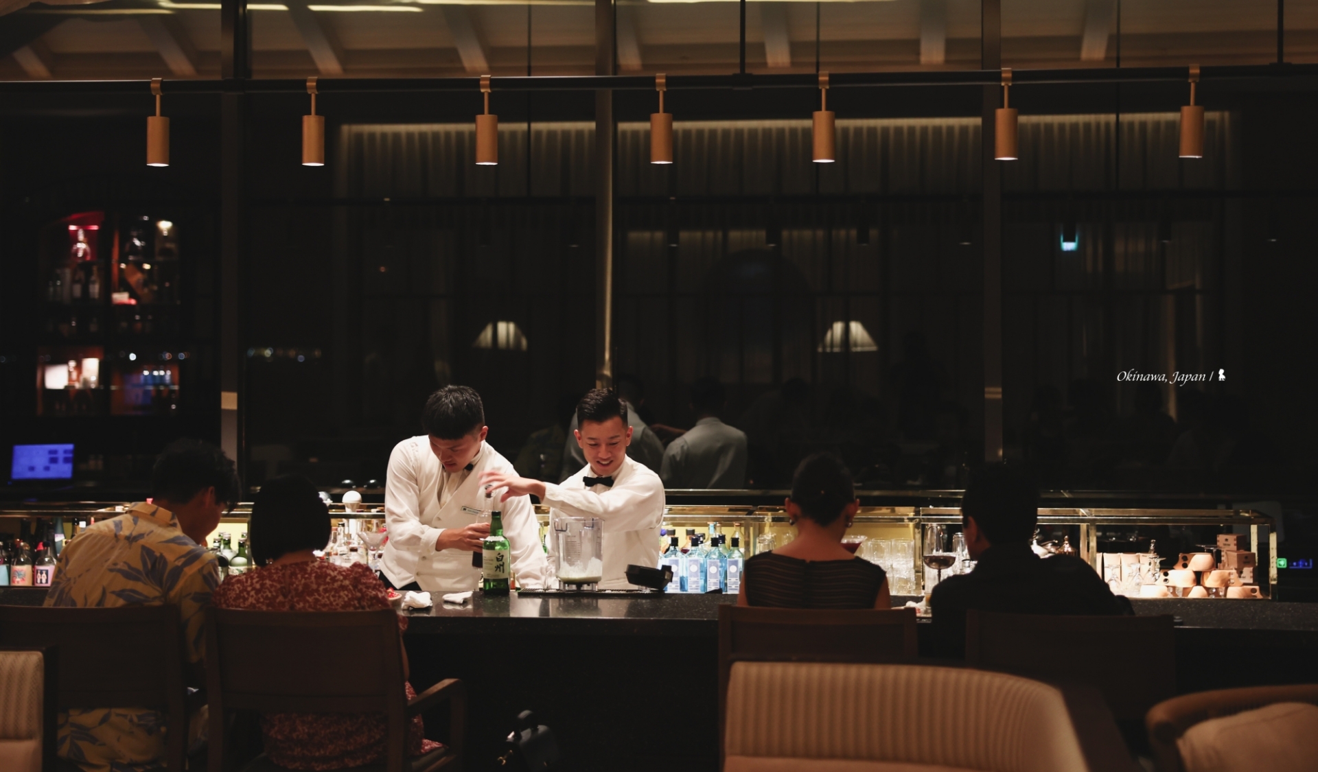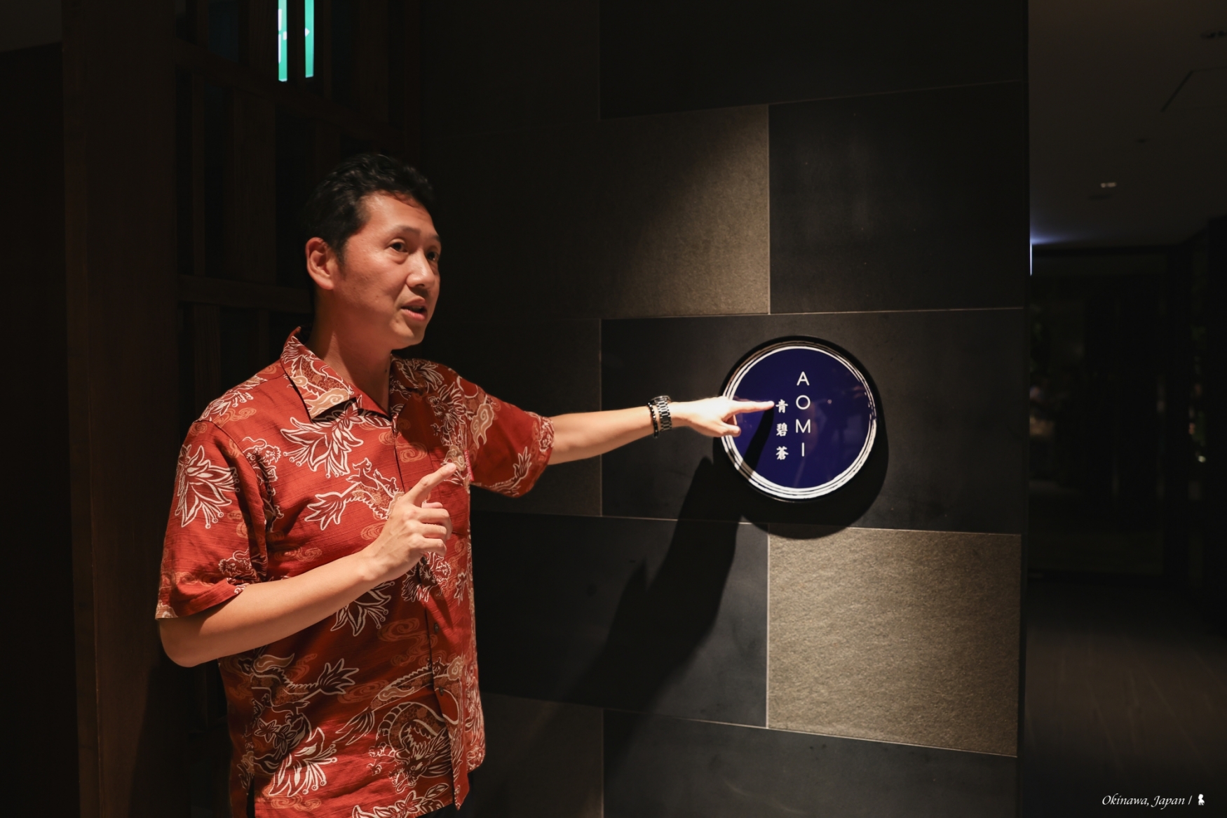 最後一頓晚餐,來體驗飯店的第四間餐廳:AOMI 青碧蒼。進餐廳前,飯店的銷售及行銷部長山本茂樹先生先在門口介紹名字的寓意,青碧蒼,這三種不同的藍,分別代表著沖繩的天、海與山脈,白天時望向窗外即可一目瞭然。