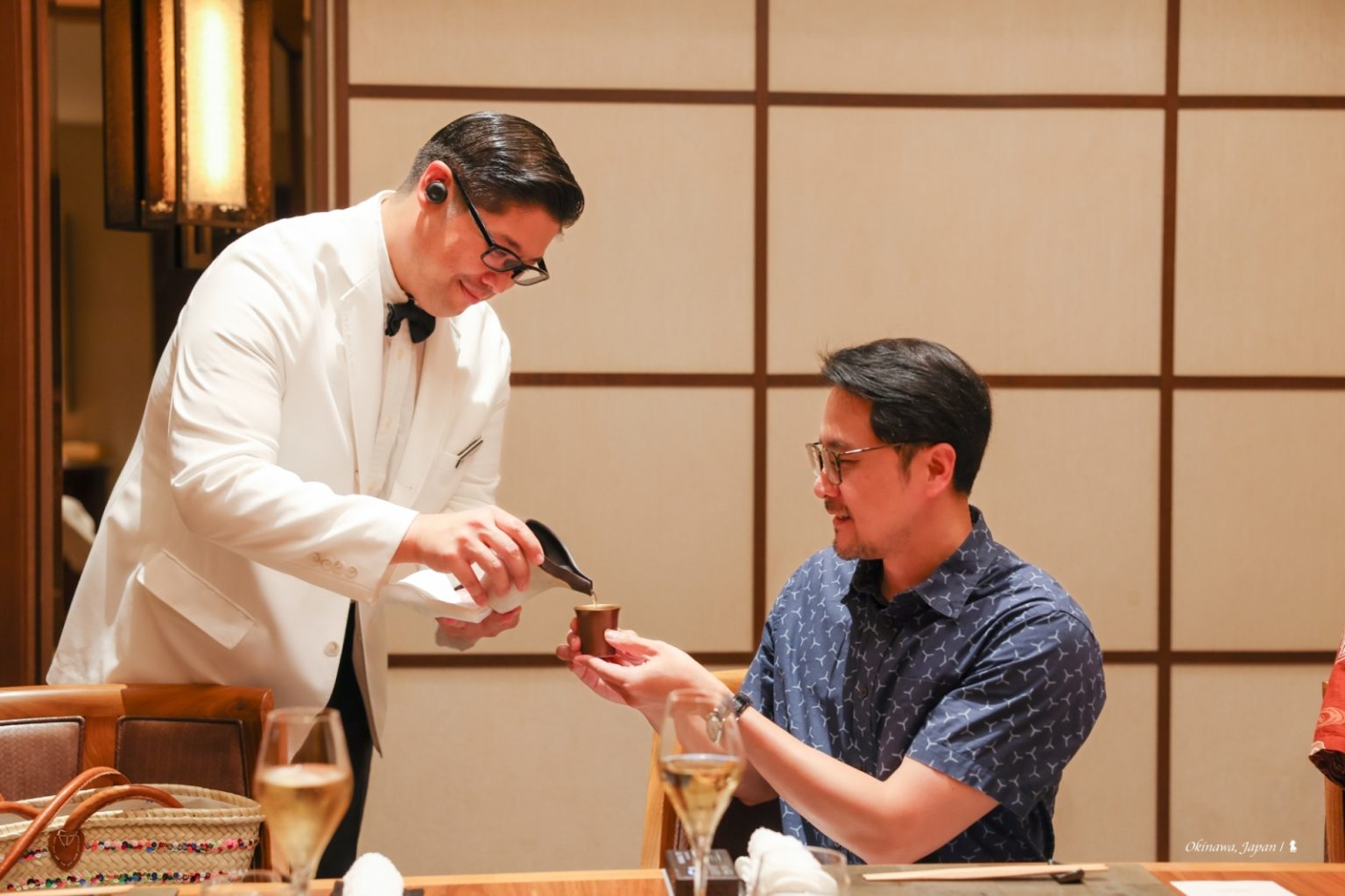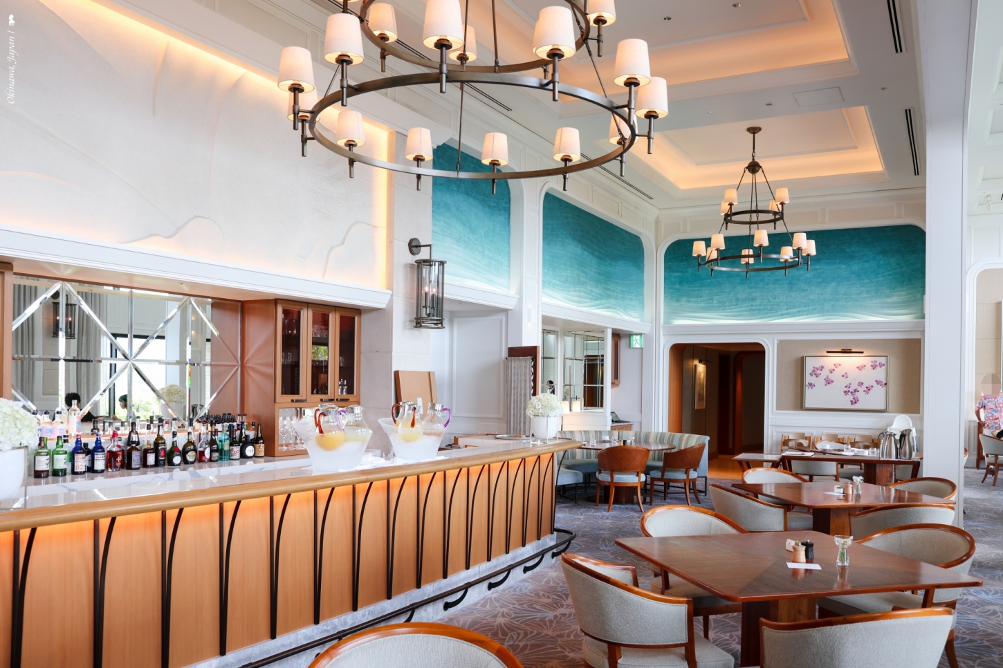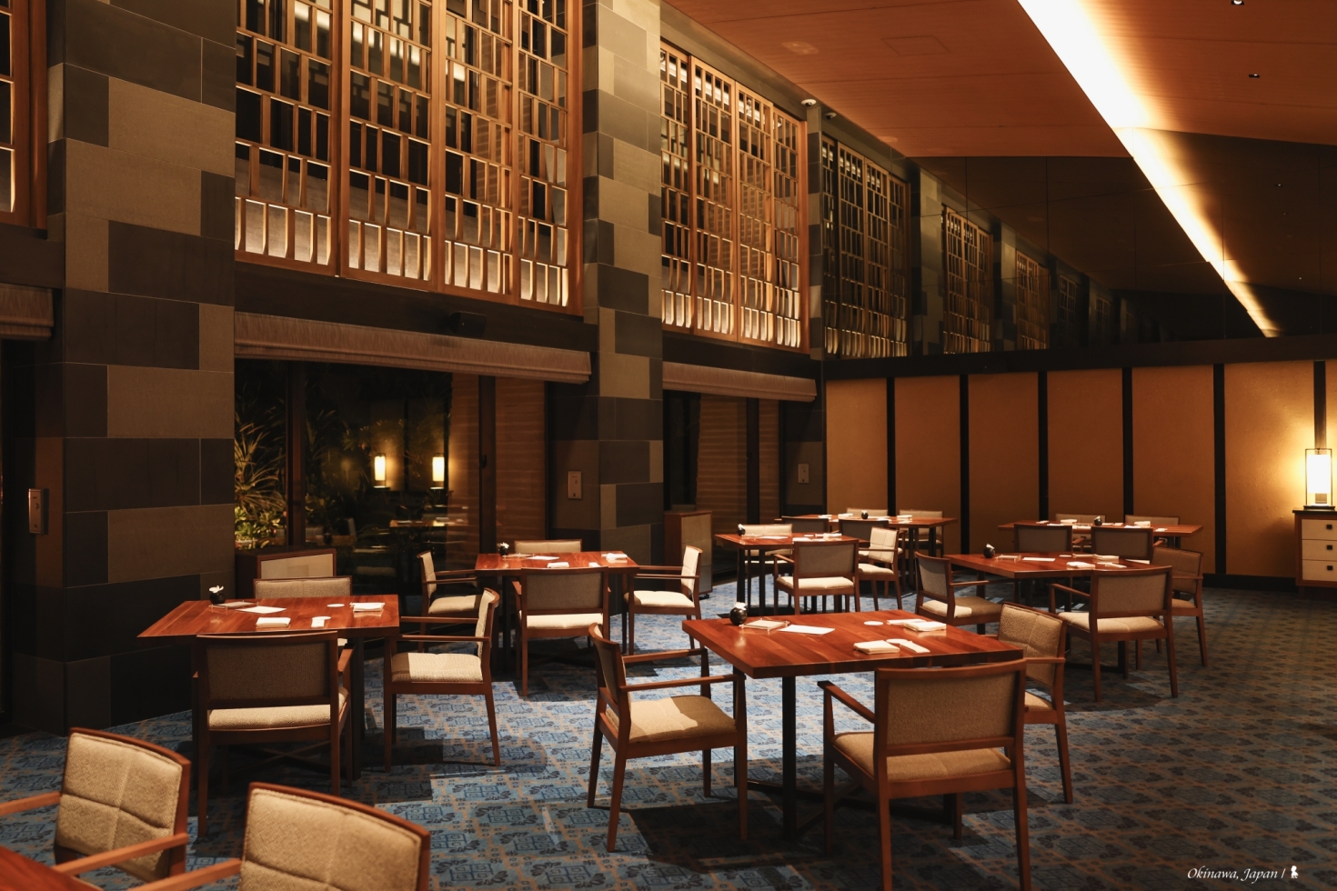 最後一頓晚餐,來體驗飯店的第四間餐廳:AOMI 青碧蒼。進餐廳前,飯店的銷售及行銷部長山本茂樹先生先在門口介紹名字的寓意,青碧蒼,這三種不同的藍,分別代表著沖繩的天、海與山脈,白天時望向窗外即可一目瞭然。