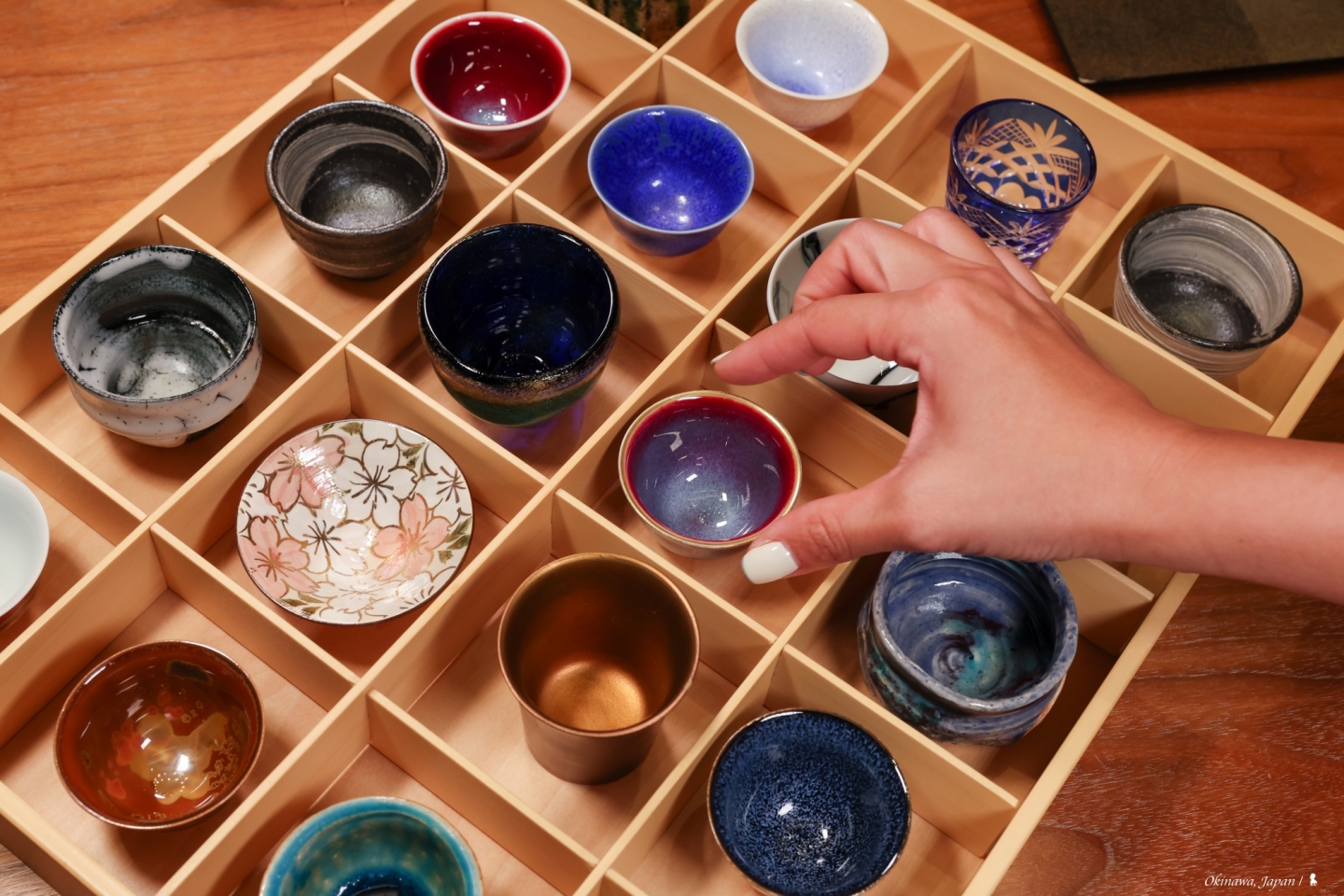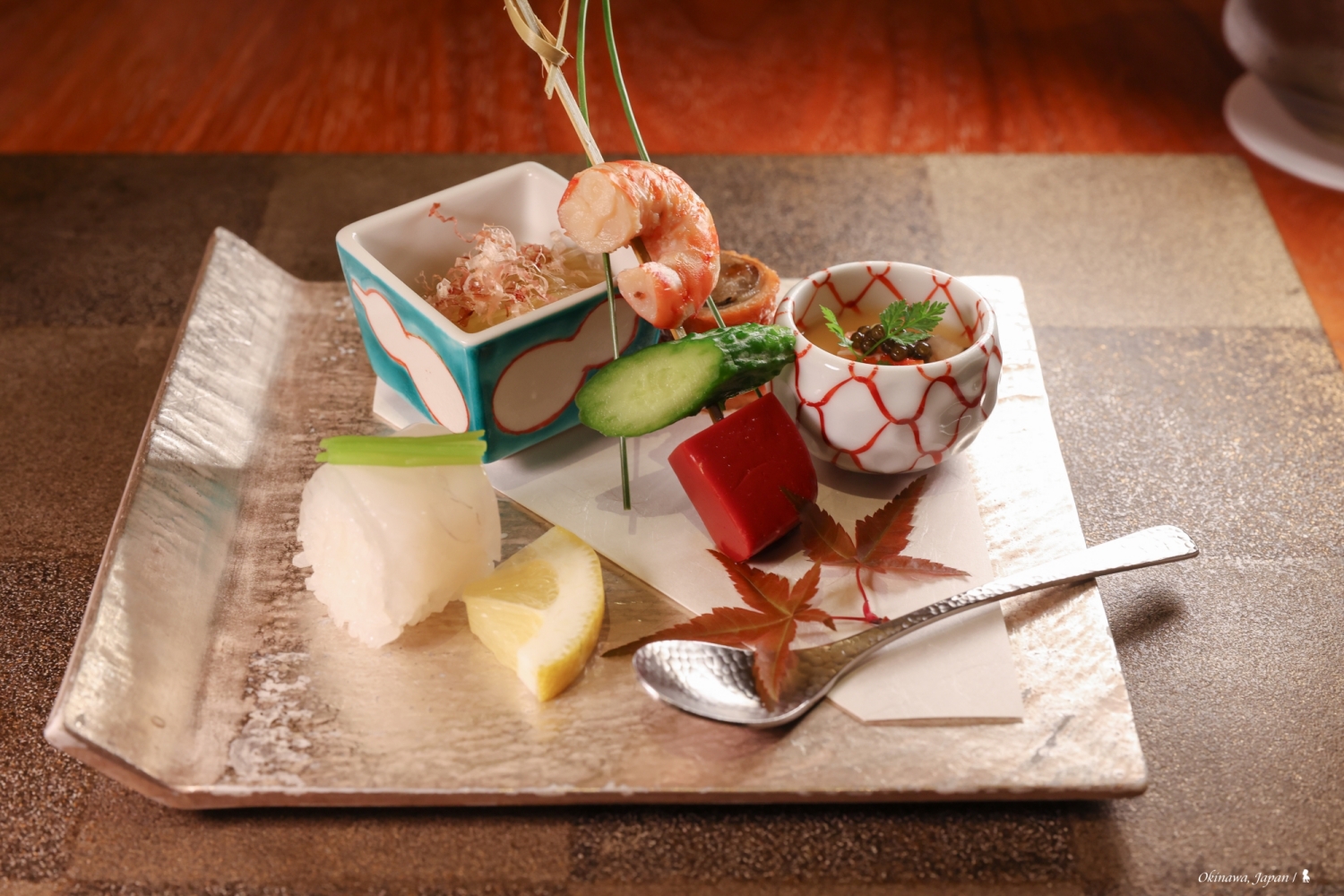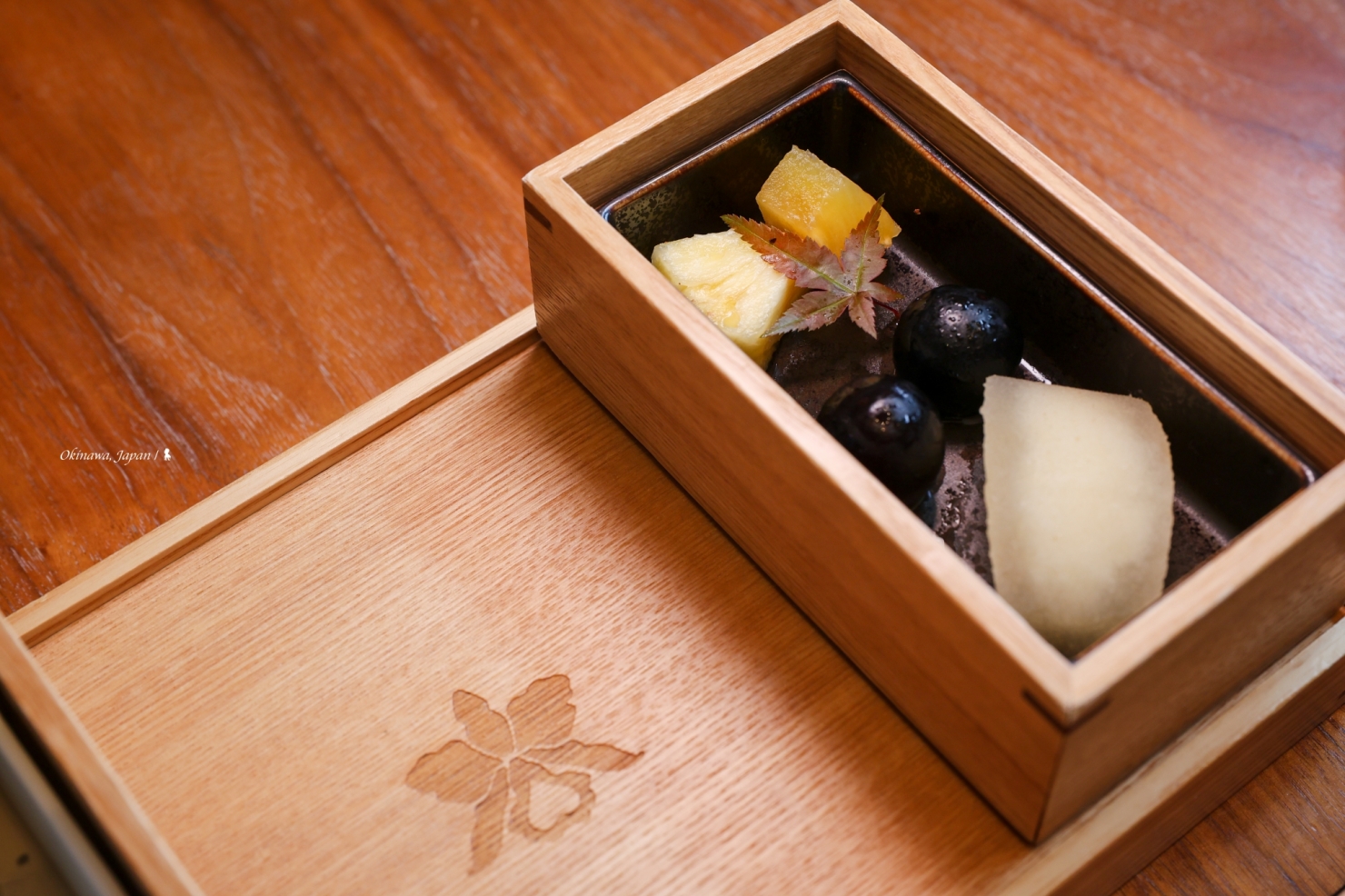 席間,侍者端上一個多格大木盒,裡頭擺放各種材質花樣的酒杯,讓賓客自己挑個喜愛的,先後準備了純米吟釀與大吟釀來佐餐。不只酒杯,器皿從漆器到陶燒不僅華美也帶入在地特色,大紅的朱槿花、金面的風獅爺,用圖案座標地理位置的同時,也用楓葉點綴出季節感,用心的懷石料理如是,細膩而有韻味…