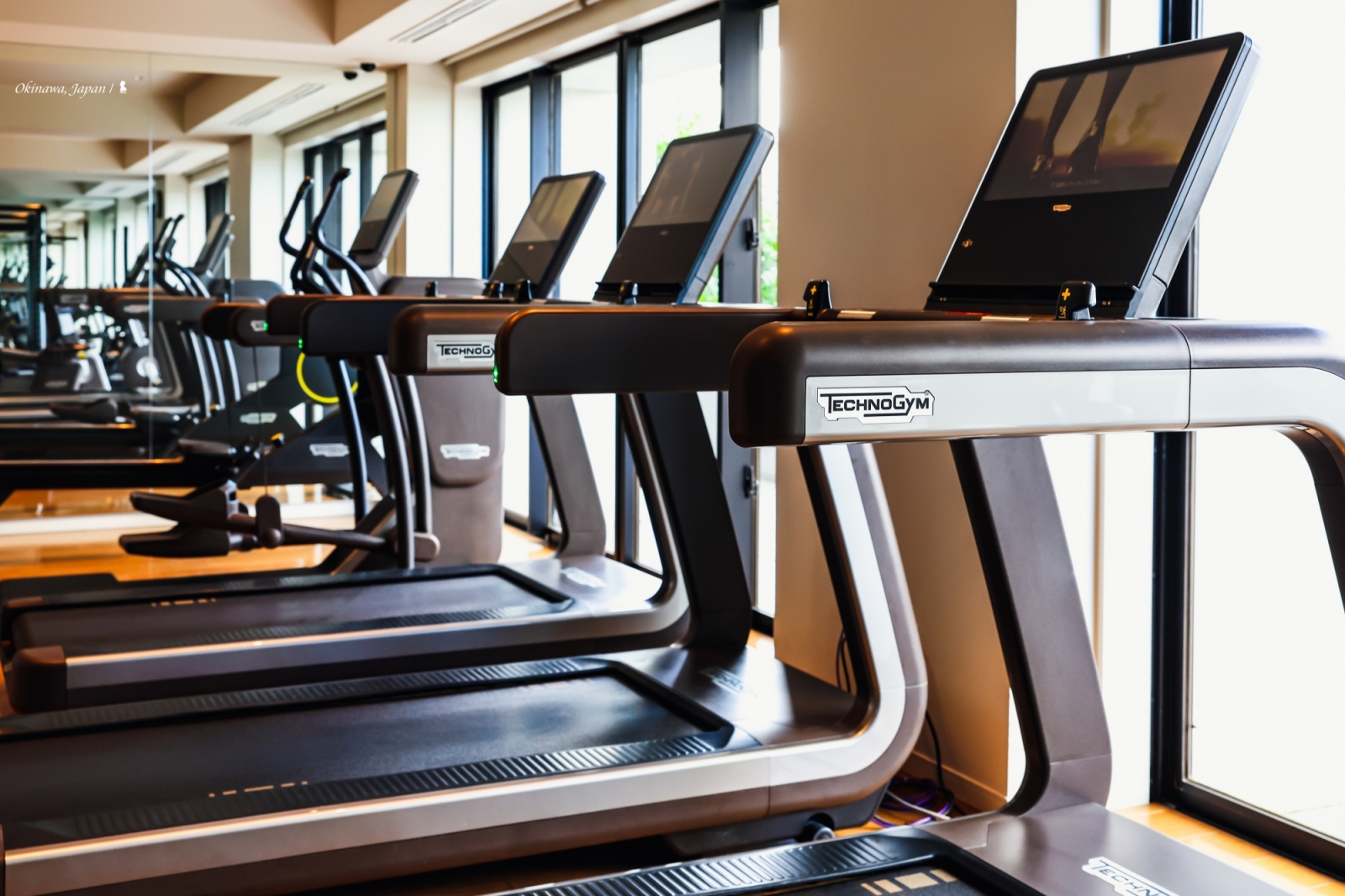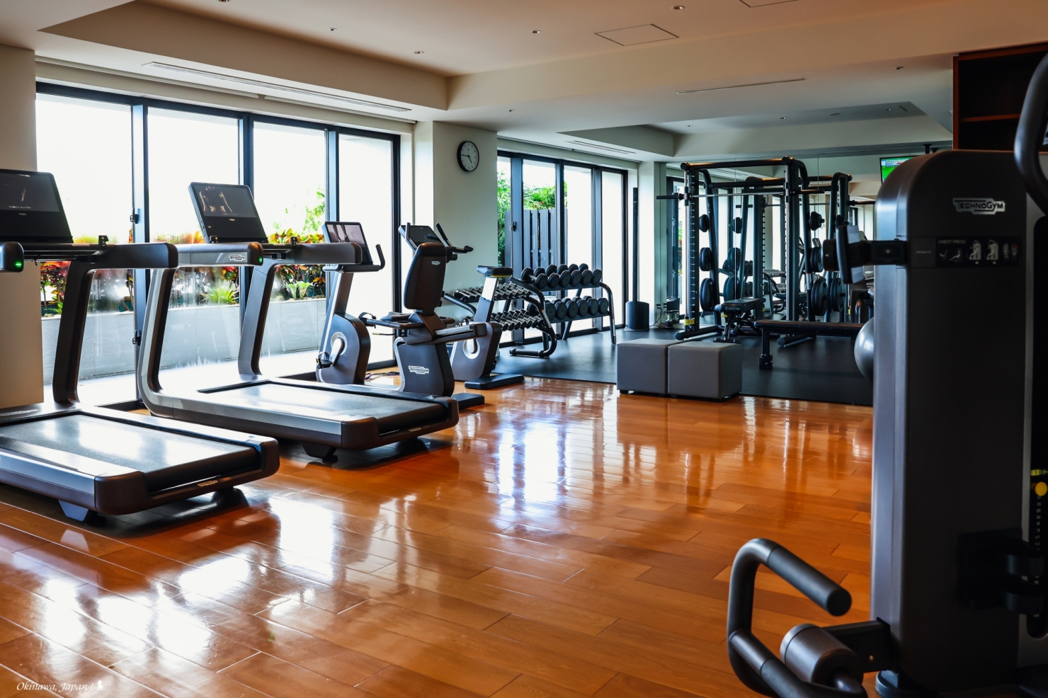 話說在沖繩海麗客蘭尼從早到晚一直被餵食也不是辦法,我趕緊利用空檔跑來位於 3F 的健身房活動一下,另外也從台灣帶了跳繩來加減有氧。這裡使用的健身器材與寶格麗東京還有「The World’s 50 Best Hotels 2024」的 No.1 曼谷嘉佩樂一樣,都是使用頂級義大利健身器材品牌 Technogym,可說是目前飯店健身房的器材天花板了,除了好看,使用起來的手感確實也很好,而且如其名不少器材都內建智能科技。不僅如此,健身房裡還使用 Bose 陣列喇叭,好音質確實能讓運動更帶勁!這的服務也周到,提供冰鎮毛巾讓健身者自取,此外若有需要也可付費報名專業教練課。