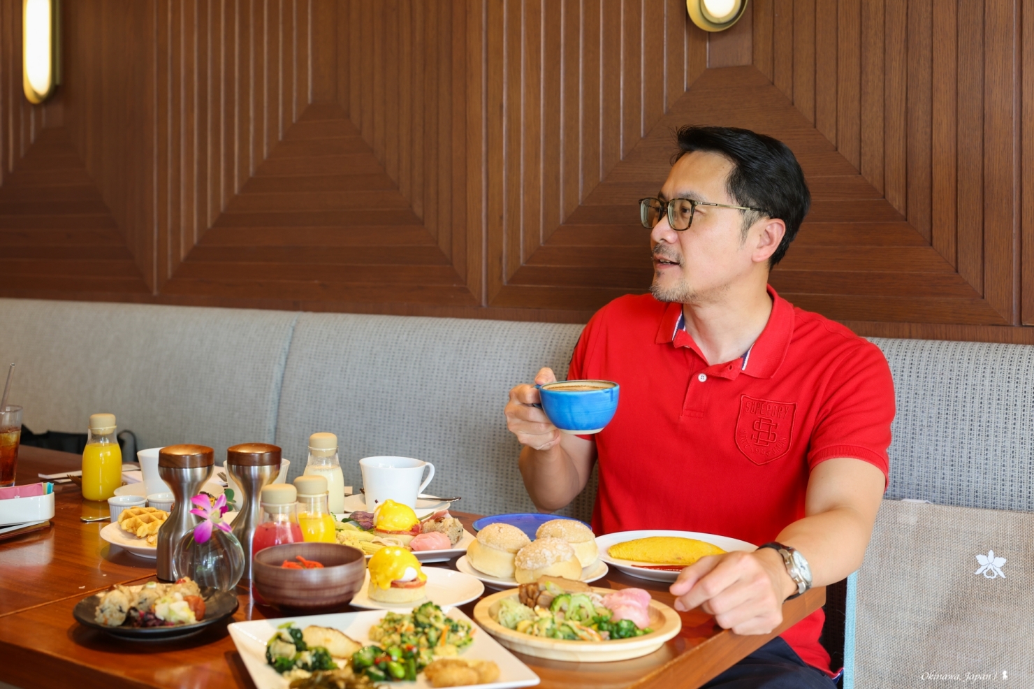 與本館餐廳最大的不同,是在這可一次嚐到夏威夷與沖繩的特色料理,夏威夷漢堡、Poke 夏威夷生魚拌飯、奶油蒜蝦飯、沖繩麵、沖繩阿古豬排都能從菜單上點到,若中午不想負擔太重也可來份放了海葡萄的生菜沙拉,最後,再來一份舒芙蕾鬆餅滿足甜點胃。對了,我對一般飯店早餐提供的美式咖啡多是敬謝不敏,但這裡的很值得一試,因送上桌的可是名貴的夏威夷 KONA 咖啡,醇厚滑順,很對味。