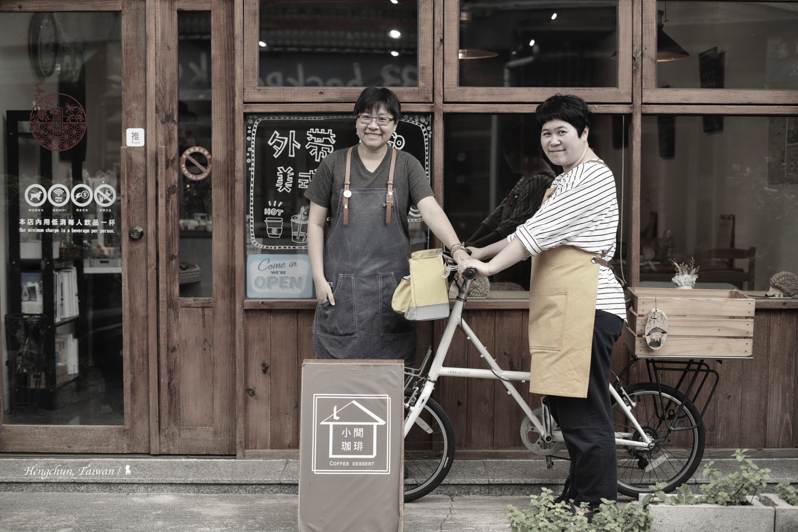 咖啡店由兩位返鄉夥伴共同經營,戴眼鏡的 Jean 負責咖啡,小敏則專攻烘焙。而店名則是源自小敏與門口那台腳踏車。原來,小敏曾經騎著那台單車,販售自己做的手工餅乾,而那台兩輪餐車就叫「小間店」。
