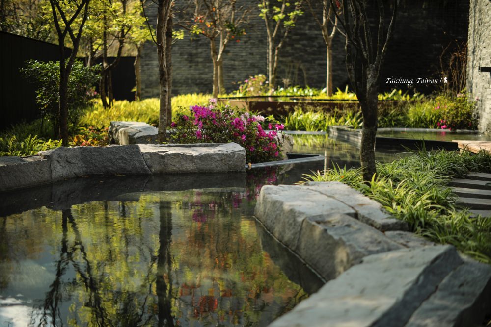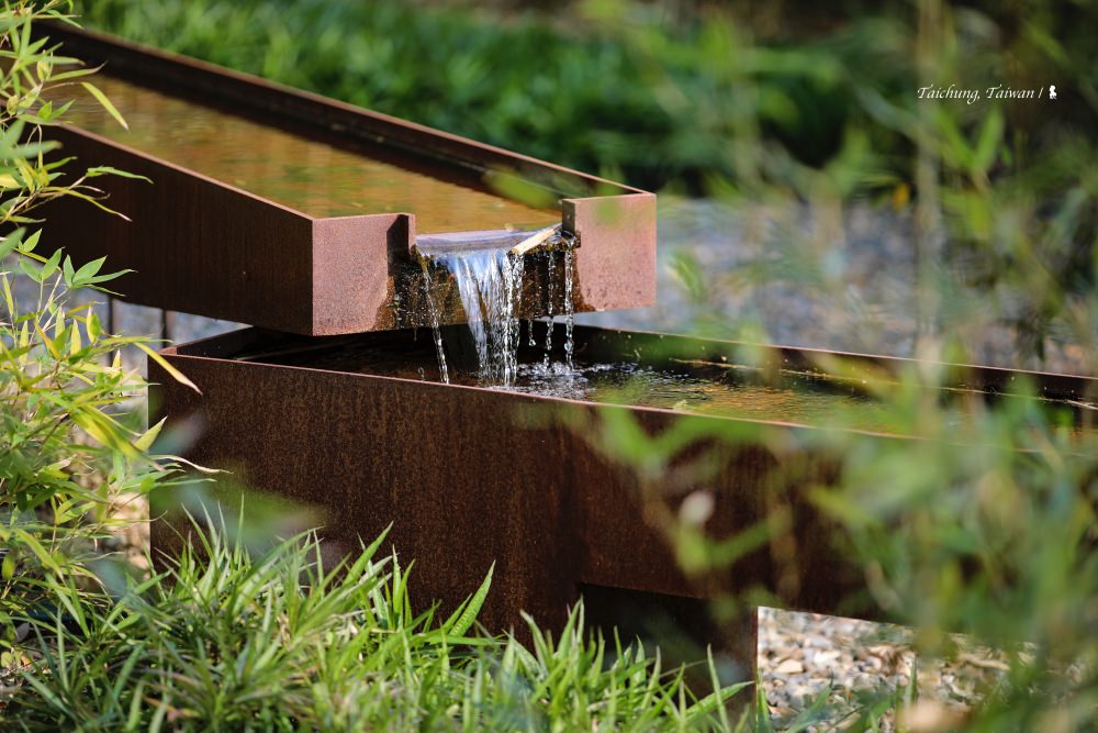 ⇑ 在設計師的巧思下,利用高低差讓水流淌過大半園區,鐵鏽是要表現日本的侘寂之美,相當低調有味
