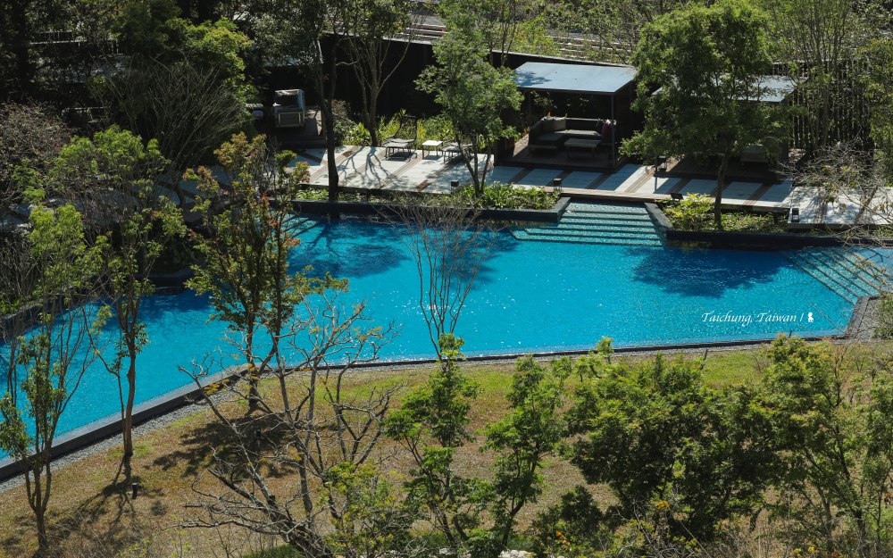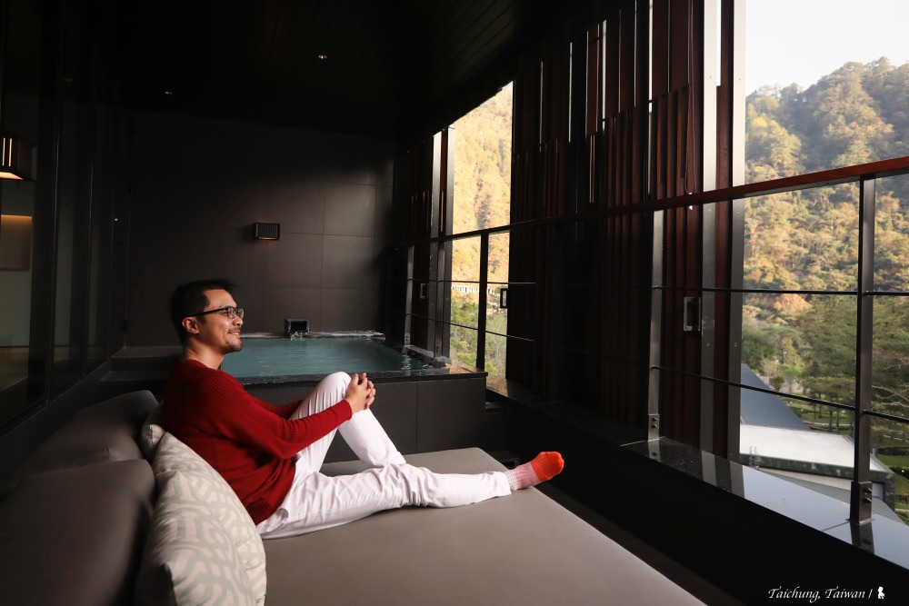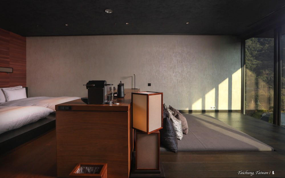 我的房間位於建築最高的 5 樓,樓中樓的設計,進門是連成一氣的客廳與臥室空間,沒有多餘的傢俱與裝飾,更顯 34 坪空間的開闊,大面落地窗將青翠山脈、園區優美的水之庭園及泳池完整收納,特別是房間的天與地使用深色系,讓外頭的巨幅流動風景成為視覺主角,光影變化下,一日四時展現不同風貌。