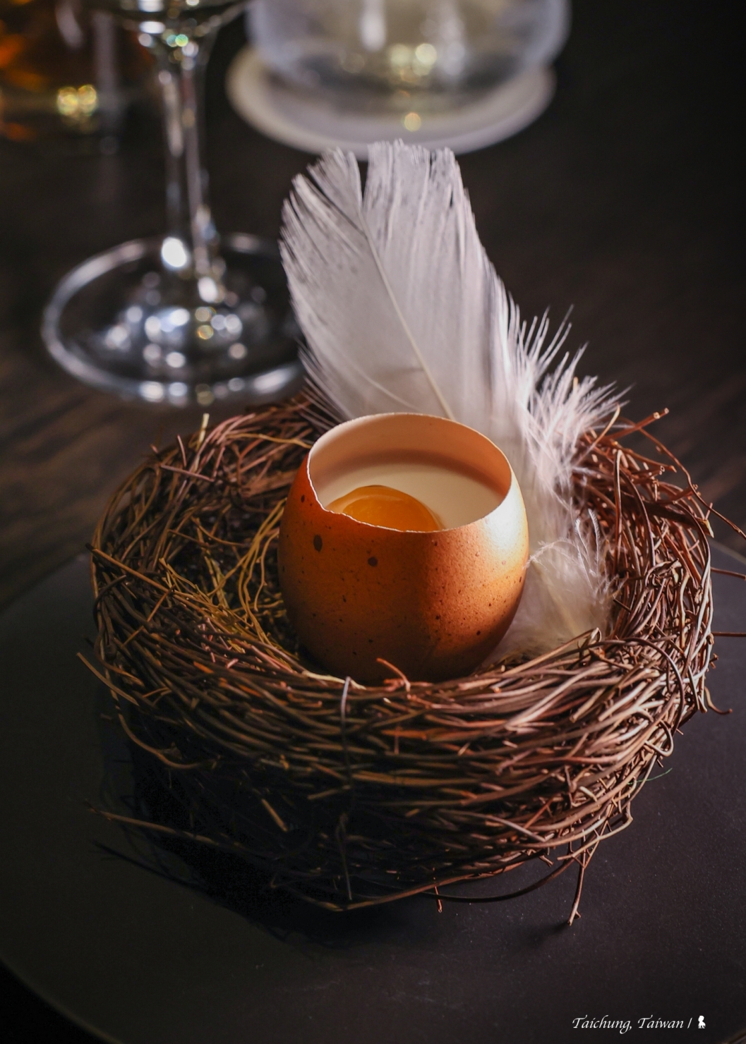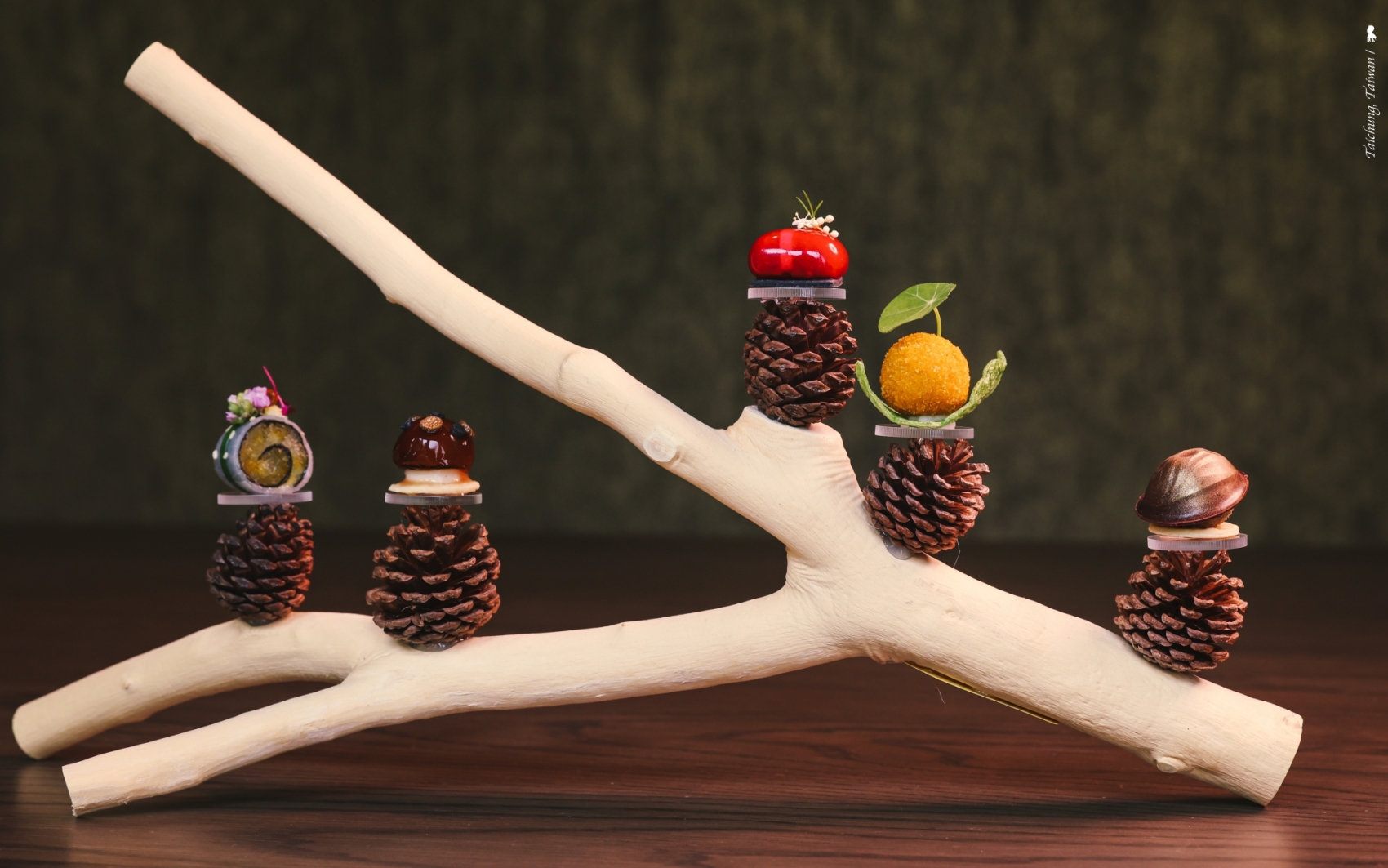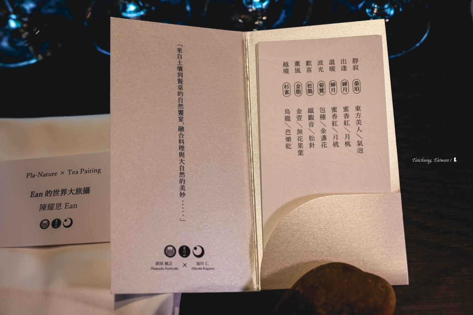 兩位料理長從谷關的大自然汲取靈感,發想以「Pla-Nature」為這次晚宴的料理概念,那是 Plate 及 Nature 的縮寫,意即將大自然濃縮於餐盤上,並以遊戲心及驚喜感作為貫穿晚宴的兩大主軸,希望能讓賓客在用餐時帶來驚喜,這點確實非常成功,甚至連大甲溪鵝卵石的意象都被搬到餐桌上,在甜點部分具象呈現。