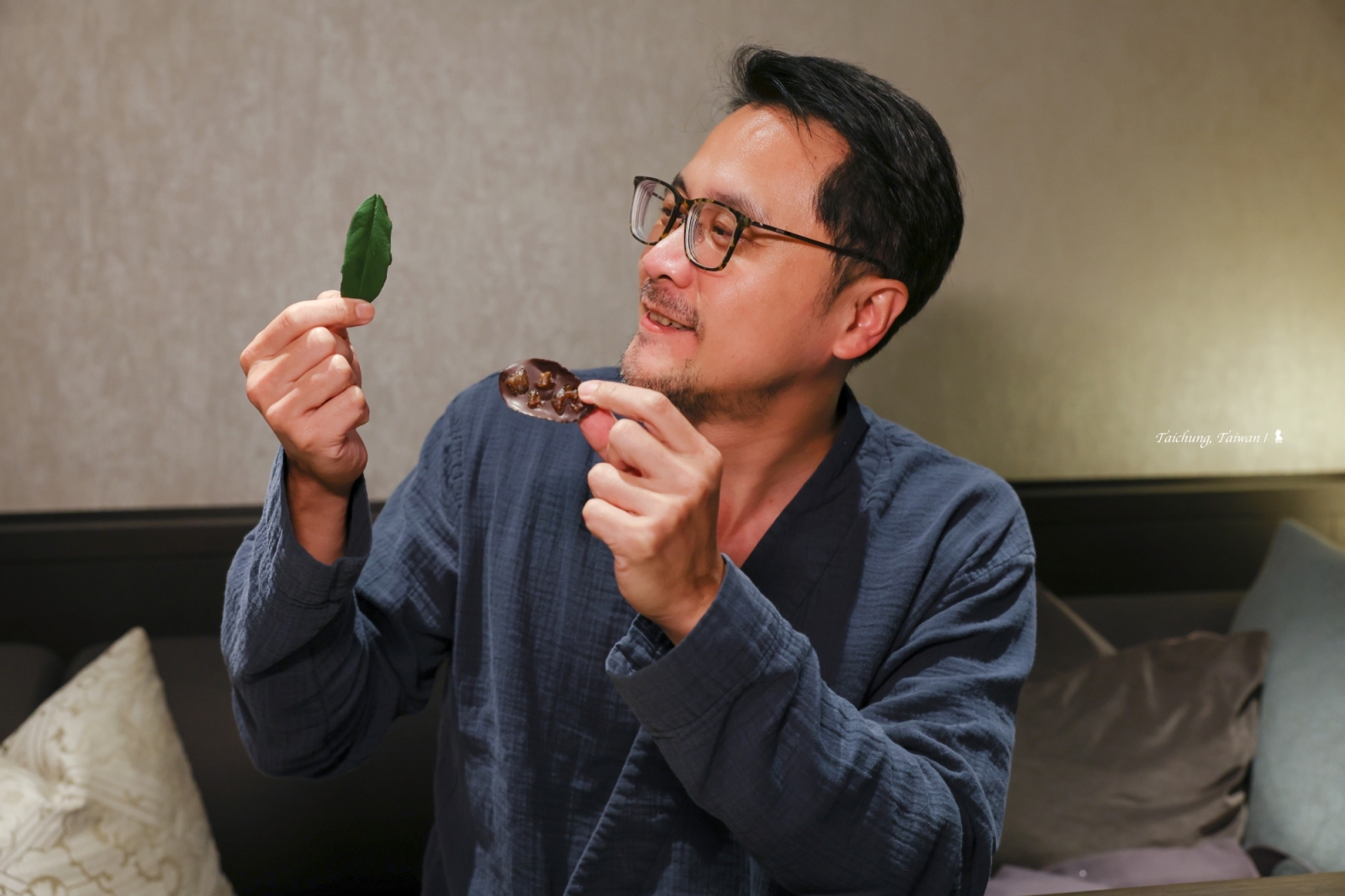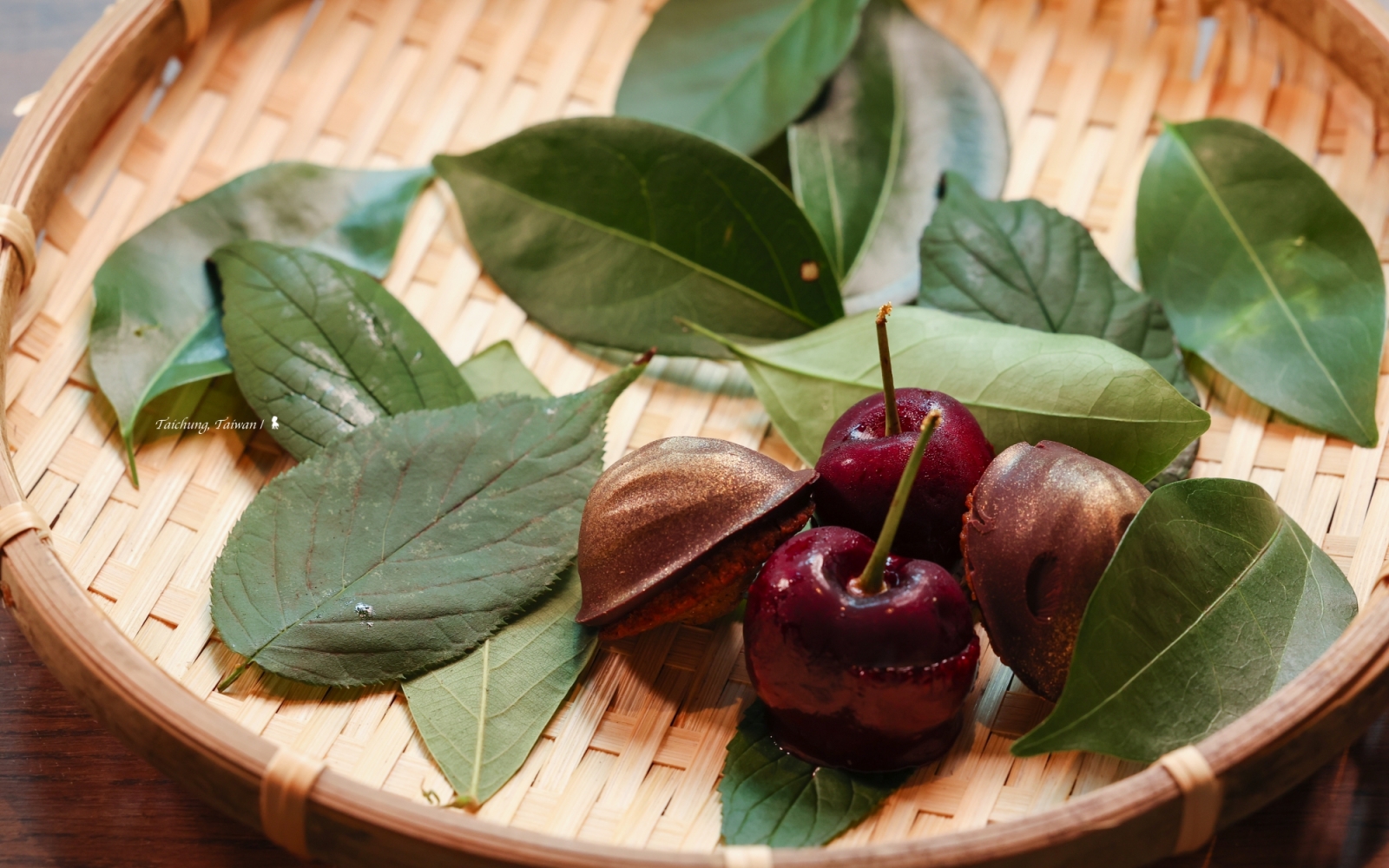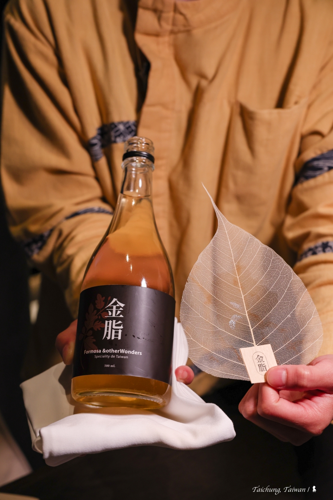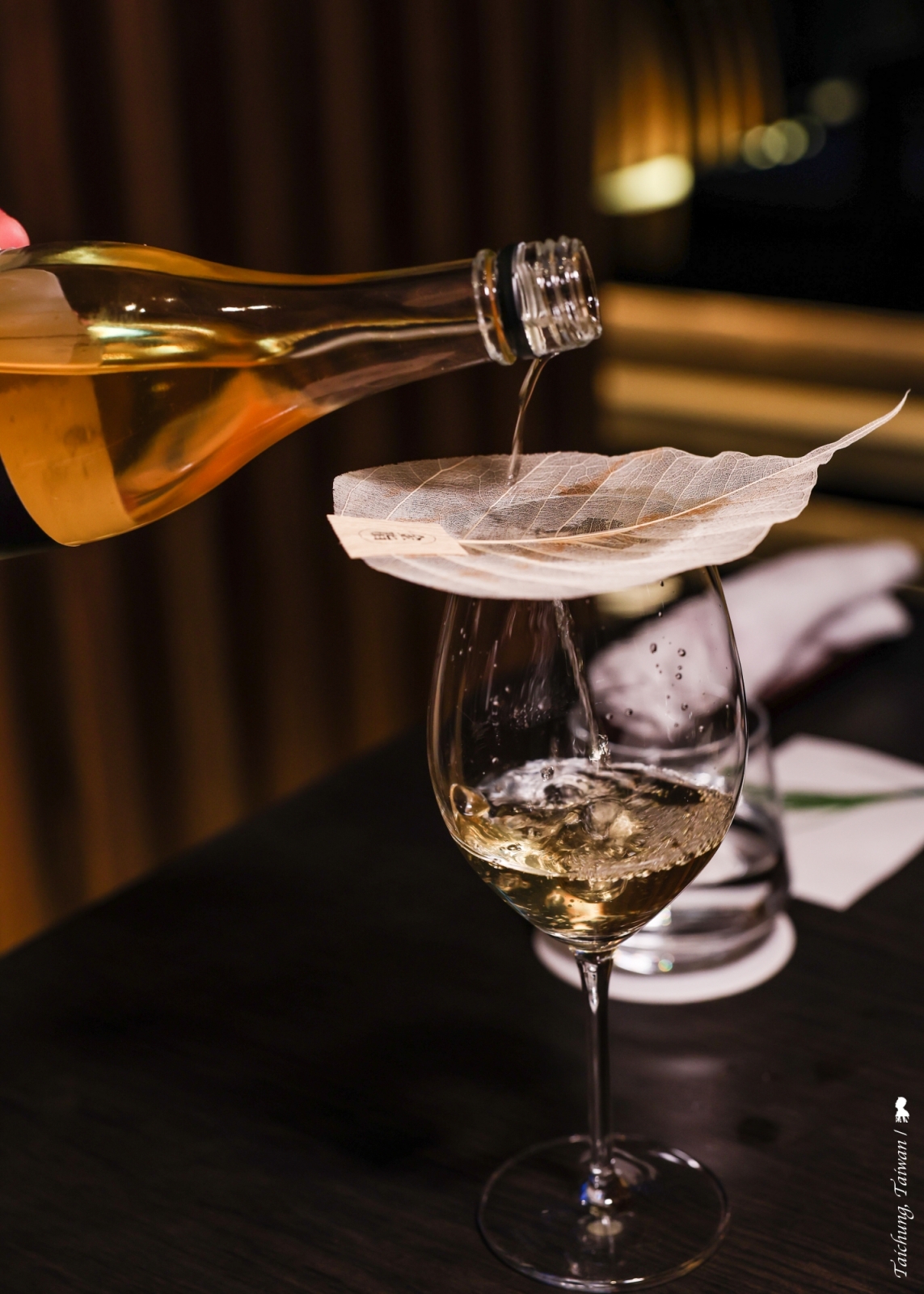 晚宴的開始與結束都不在餐廳裡,餐前酒的品飲地點特別移到室外庭園,為的是要更貼近本次晚宴的「Pla-Nature」料理概念,於是,香檳及無酒精特調被置於新鮮花卉中,讓賓客品飲同時還能嗅聞到淡雅花香,並沈浸在蟲鳴鳥叫的大自然氛圍裡。而料理最後一道帶來驚喜的甜點「名殘」,是放在客房的冰箱內,讓賓客餐畢回到房間享受最後的一道食藝遊戲,在一盤宛如散落茶葉中找尋偽樹葉,那是同樣有著樹葉輪廓與葉脈的巧克力,背面還鑲著龍眼與芭樂果乾,相當有趣。