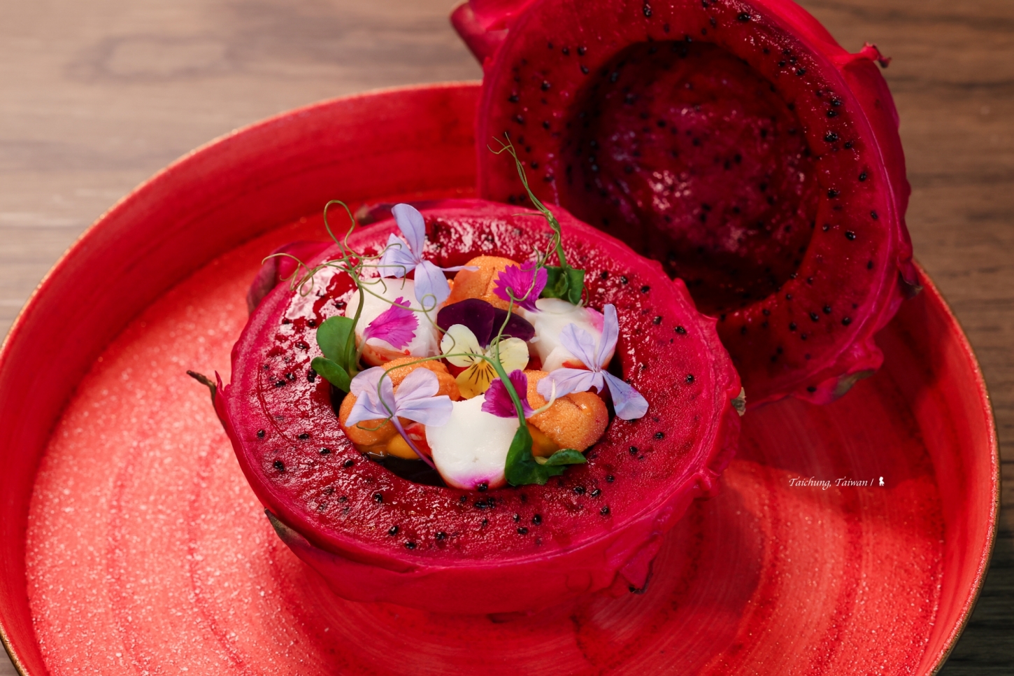 ⇑ 〈出逢〉以台灣在地的紅肉火龍果為器皿,加入海膽、車蝦及海鮮高湯晶凍,讓賓客打開蓋子的那一剎那彷彿看見色彩鮮豔的迷你花園