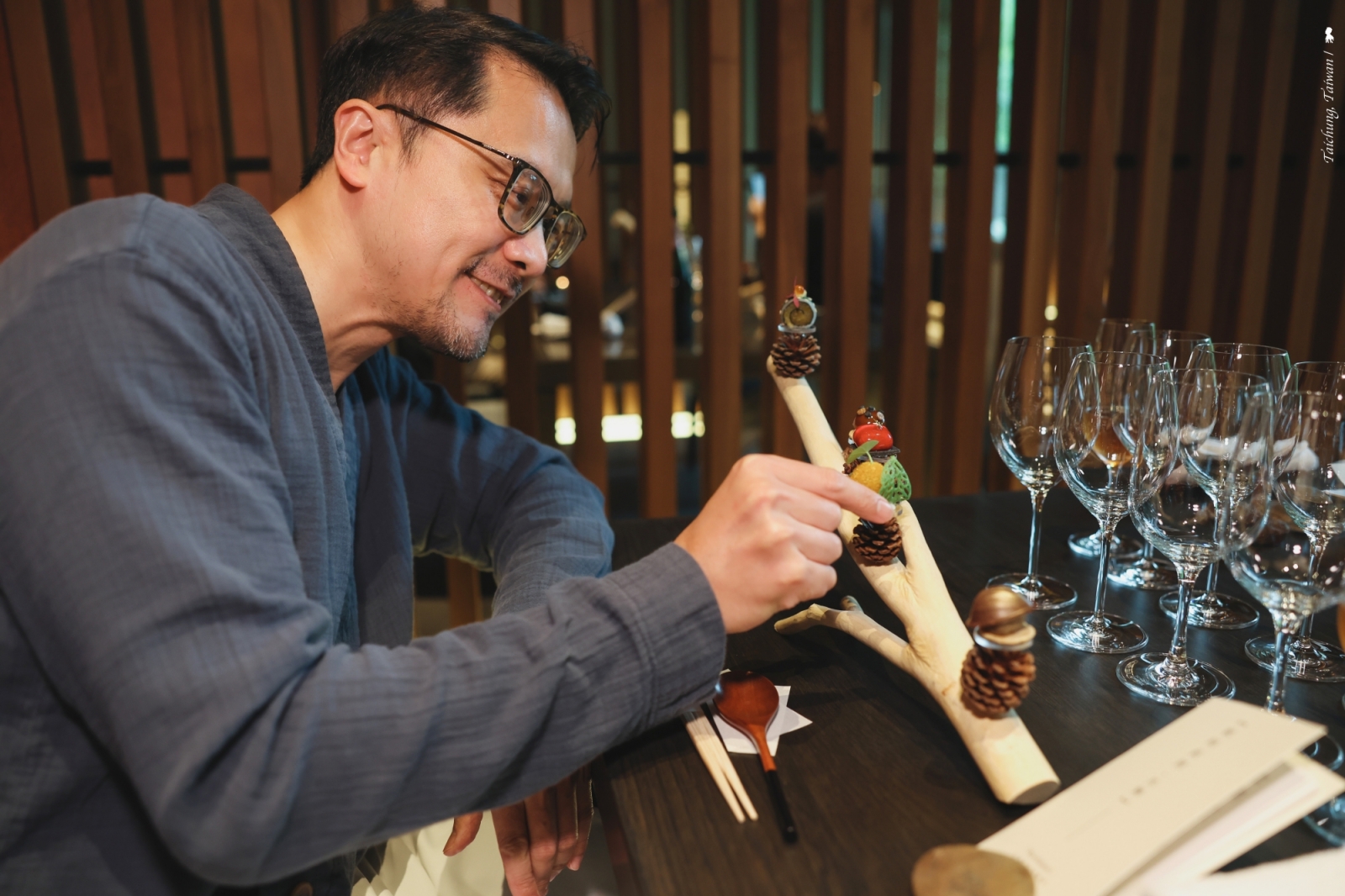 雖說兩位料理長分別擁有深厚的法餐與日料根基,但考量這回的餐宴舞台是在台灣谷關,他們很有誠意的不僅使用了台灣食材,還將多種台灣飲食文化融入到料理的設計中,像是在「薰風」這道將台灣庶民美食滷肉飯結合了鵝肝,在甜點「越境」,則是以料理長首次在台灣品嘗到的釋迦放入雞蛋布丁中,還有泰雅族竹筒飯帶來的靈感,為此甚至他們親自上山砍竹子,製作成多種用餐層次樂趣,結合湯品、糯米飯成了「溫暖」這道。