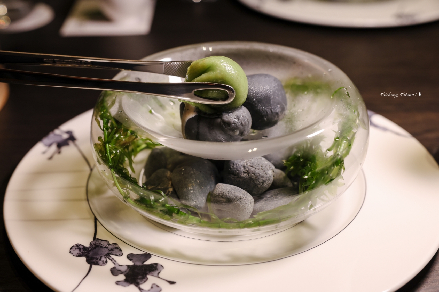 ⇑ 〈殘響〉為第二道甜點,以大甲溪的鵝卵石為意象,同時又以桌邊料理形式將巧克力小籠包放上鵝卵石冰品,不僅有趣也交疊出風味的撞擊