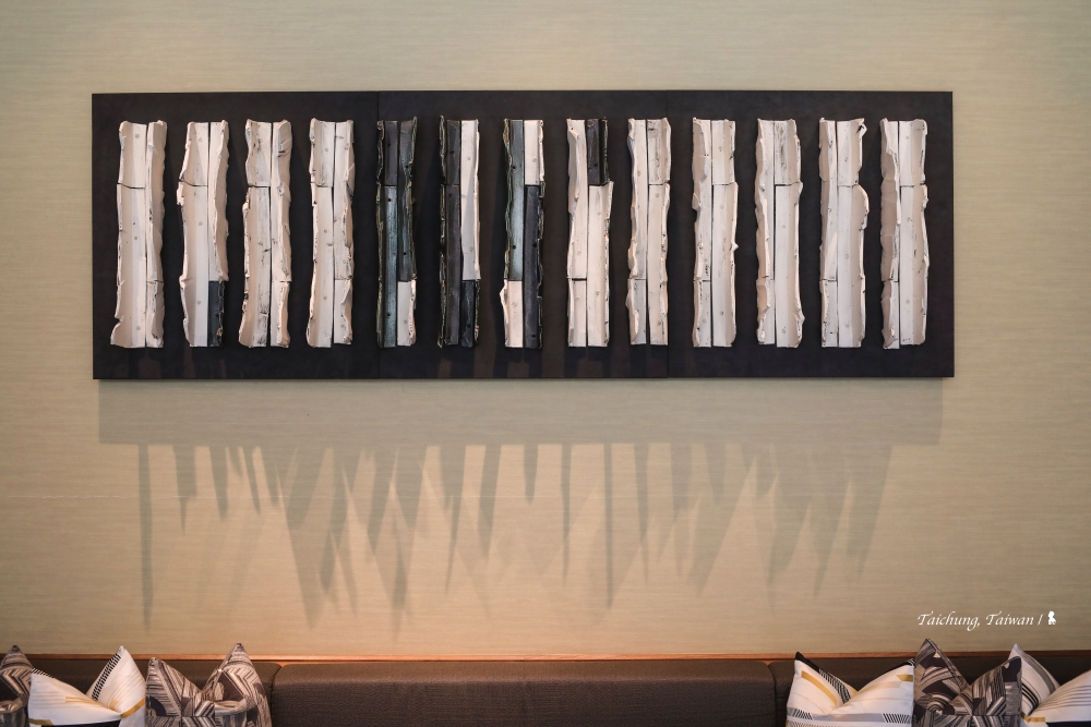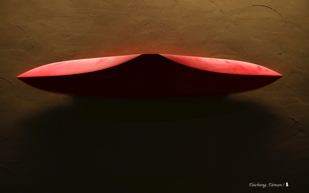 房客多不會錯過懸掛在住房一樓電梯口對面牆上的這件作品,但可能不知所以然。寬 200 公分的這件作品是鐵上鍍膜,我之前看以為是個熱情的烈焰紅唇,原來,要呈現的是日出東山意象。飯店人員表示當早晨房客搭乘電梯下來,門一打開就會見到朝陽從山峰漸漸顯露的景象,紅色對應的是健康與力量的脈輪,在一日之始希望能給旅人滿滿能量!