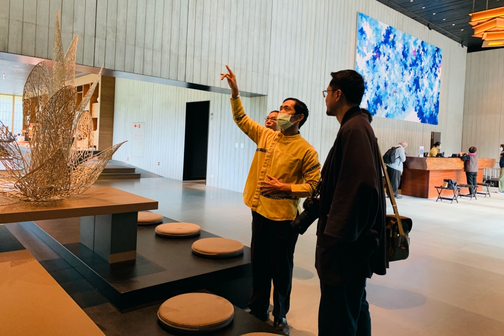 三訪虹夕諾雅 谷關,符合期望的是在熟悉環境中獲得讓人放鬆的日式款待,除了揮灑季節感的大自然顏色與依時設計帶有儀式感的體驗活動(請見:「一日一組 虹夕諾雅 谷關推「溪谷秘境之湯」,動靜品味台灣奢華冬景色」),來增添新鮮感外,印象深刻的是,還讓我見識到了日本頂級旅宿的彈性與細膩。每日早晨,都有我很推薦的免費體驗活動「草花散策」在水之庭園準時登場,萬一天候不佳不方便舉行也別失望,此時就有機會參加到隱藏版本,走進室內認識具代表性的藝術品。這下真讓我欣喜了,之前來大概只會簡單了解接待大廳牆上的兩幅巨幅畫作,剛好趁這次機會,好好認識擺放各處的藝術創作!接下來就跟著 Ean 一起來趟虹夕諾雅 谷關美術館典藏之旅。