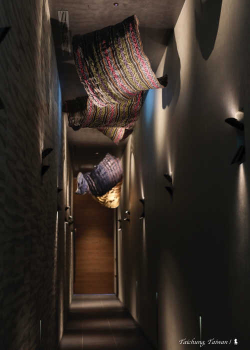同是少數的在地藝術家作品,更難得的,還是表現在地文化。這件泰雅族的織布作品,吊掛於餐廳走廊,泰雅族的彩虹橋傳說,是族人的生命哲學,也代表生命的循環之意。