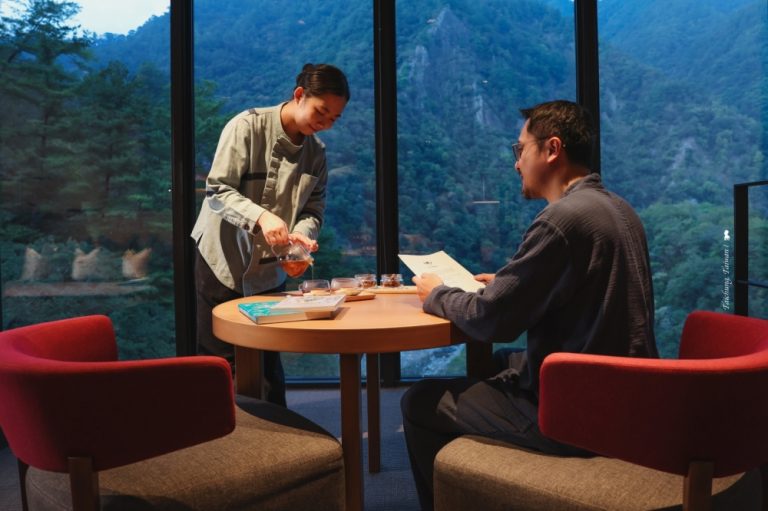 這次入住面向峽谷的「月見客房」,若記得沒錯我之前應有住過同個房間,但,每次來總是感受不同,或許是落地窗引入的自然風景與時俱變,也可能是他們每次針對不同限定方案所盡心設計的體驗內容總帶來新意。在客房辦理入住手續的同時,他們會因應專案不同為客人準備茶飲與小點。管家在撕掉甜點外包裝時被我不小心偷瞄到,當日選用的是「源吉兆庵」紅豆沙栗子餡的織部錦,品牌官網的售價是 90 元/個,給的很大方但其實多不會特別強調,因為覺得那只是款待的基本。搭配的茶品是黑糖薑茶,房客可視口味自行調整比例,扣緊活動主軸的茶點組合,讓旅人從一開始就讓心跟身暖活起來。
