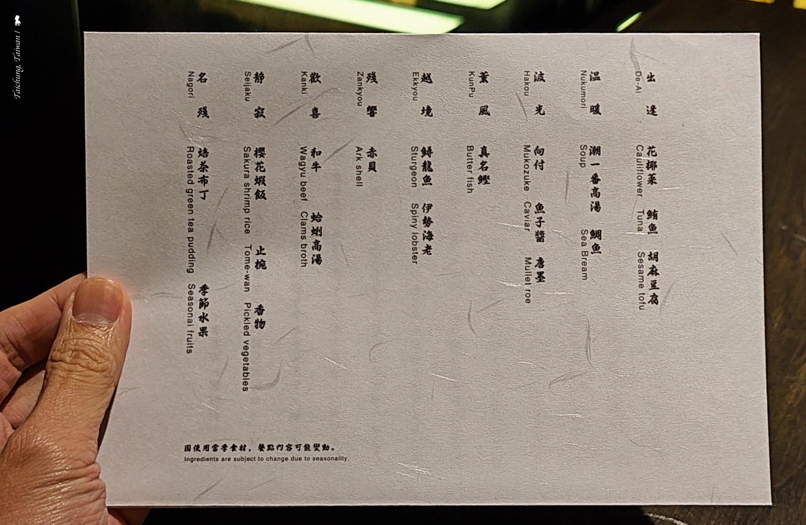整套料理品嚐下來,美味也見驚喜,有別於前幾次會席料理感覺是在傳統中創新,我覺得這次剛好相反,是在創新手法中表現日式傳統料理的精神。不管是料理設計或餐具器皿的選用,我有感受到料理長想讓旅人在用餐體驗中,領略無法輕易言說的侘寂之美。料理長微笑請我期待將由他完全設計的下一季新菜單,我彷彿看見剛踏上一段新旅程的料理魂正燃燒著,當然,我也很好奇接下來會如何把台灣風土融入到他的料理創作中。就像最後甜點「名殘」所喻,餘音仍在繞梁但我不自覺的已做好迎接下回再訪的準備了!
