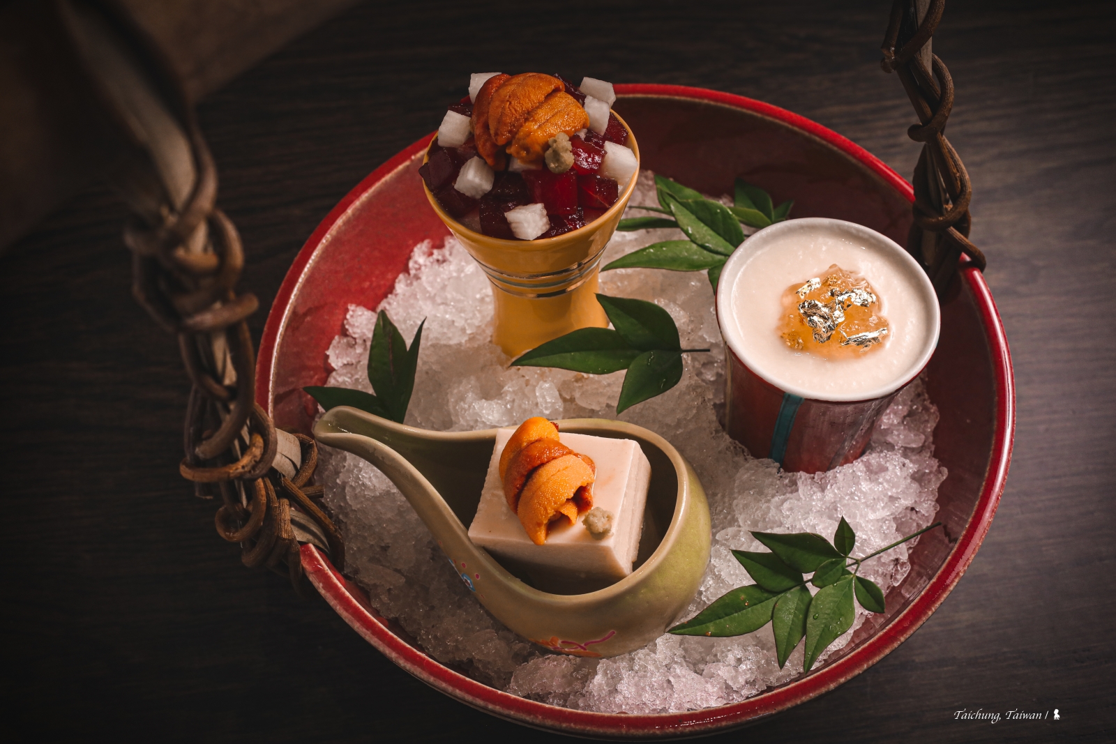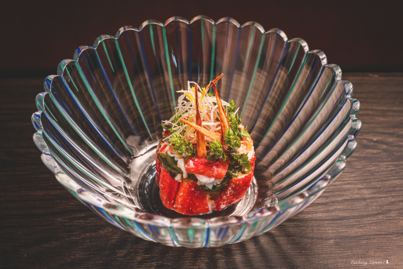 此為會席料理的開胃菜,第一道「花椰擂流」為傳統料理,將蔬食研磨成泥後熬煮成日式濃湯,加上鮮奶油來豐富層次。第二道「鮪魚山藥 霰」是把生鮪魚切成丁狀,以醬油入味、佐山藥一同享用,很清爽!第三道「胡麻豆腐 雲丹」則將芝麻與葛粉製成的胡麻豆腐並搭配海膽,清爽中見濃郁,很順口的組合。