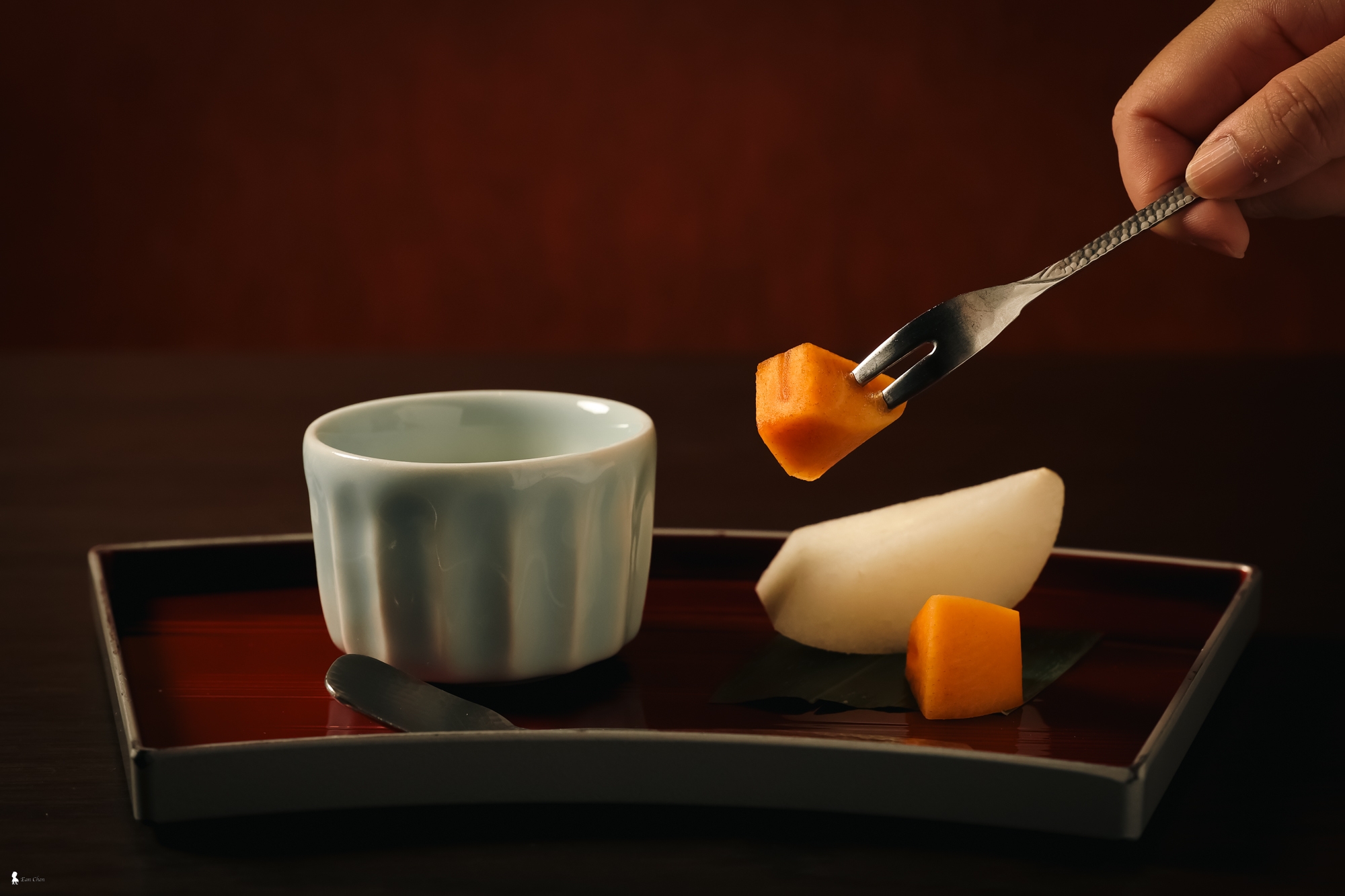 這次「漆脈相傳」專案的朝食,有別一般是前往餐廳用餐,而是將整套饗宴送至客房內享用。當我看著服務人員大費周章地將精緻料理與器皿送入房內,在窗邊細心地調整擺盤位置時,一股強烈的既視感油然而生。