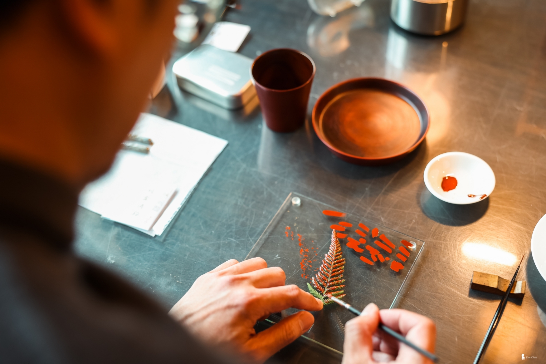 這並非一般的 DIY。我們手中的漆器杯,是光山行經過 14 道繁複工序、耗時一個月製成的半成品。賴老師帶領我們運用虹夕諾雅 谷關「水之庭園」裡的植物作為素材與靈感,將其拓印在漆杯上,再撒上金粉。當金粉落在漆上,植物脈絡瞬間變得立體並具意境,這不就是最具紀念意義的「谷關塗」嗎?