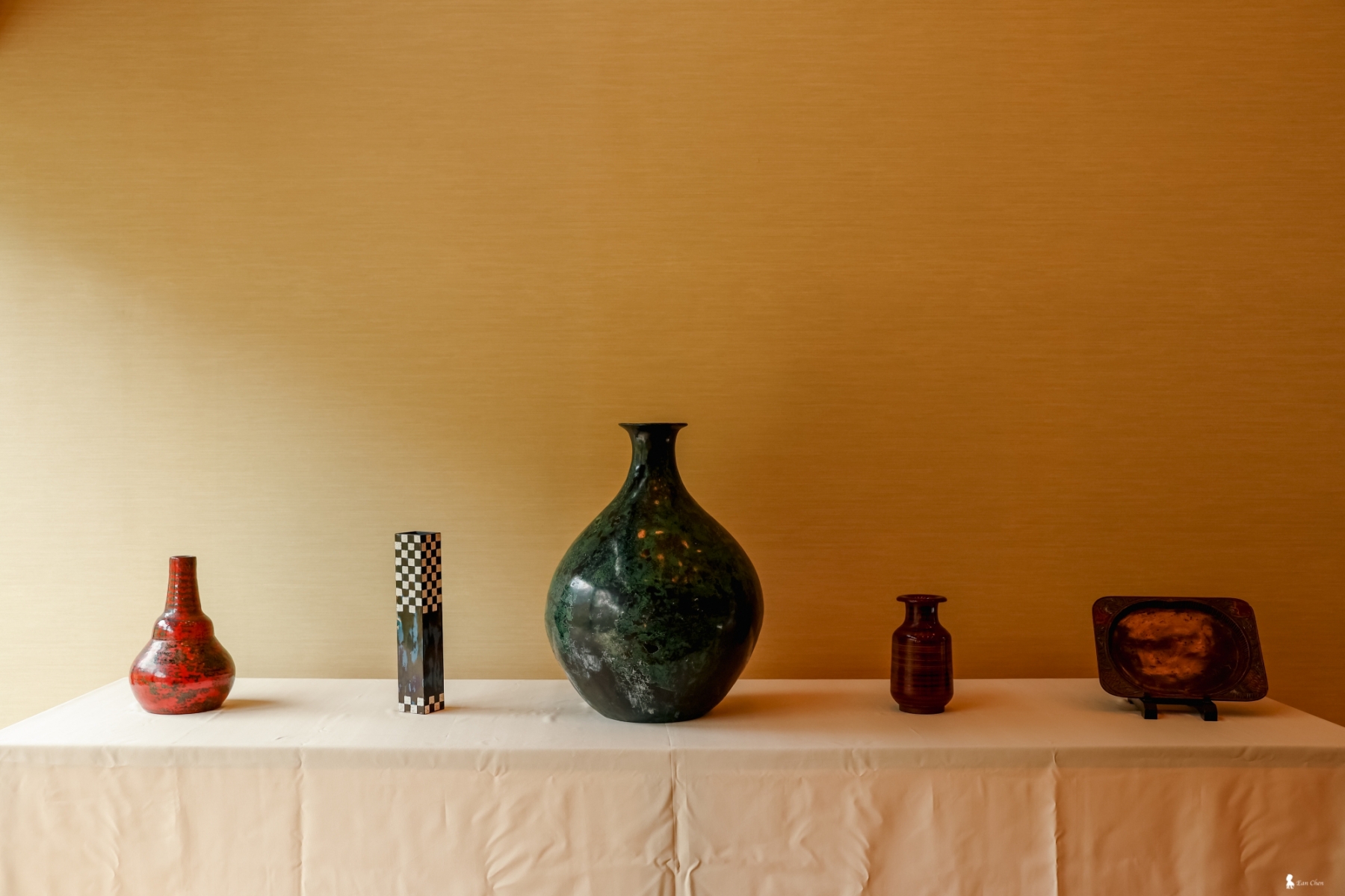 另一個視覺上的衝擊,來自一只巨大的花瓶。它的量體看似沈重無比,但當我實際將其抱起,那意外的輕盈感讓我大開眼界。原來,這是使用了高難度的「脫胎」技法,以布為胎骨,層層上漆後脫去原型而成。